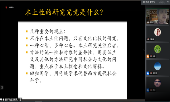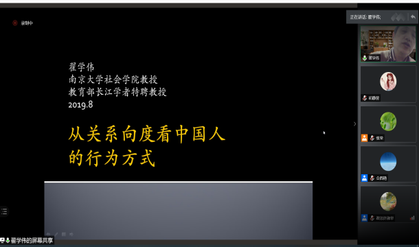 11月3日,我院青龙山论坛(秋冬季论坛)第四期在腾讯会议平台顺利举行。活动邀请南京大学社会学系主任翟学伟教授做题为《从关系向度看中国人的行为特征》的专题讲座。讲座由政法学院党委书记徐庆国主持,学院师生及相关学者240余人在线参加。