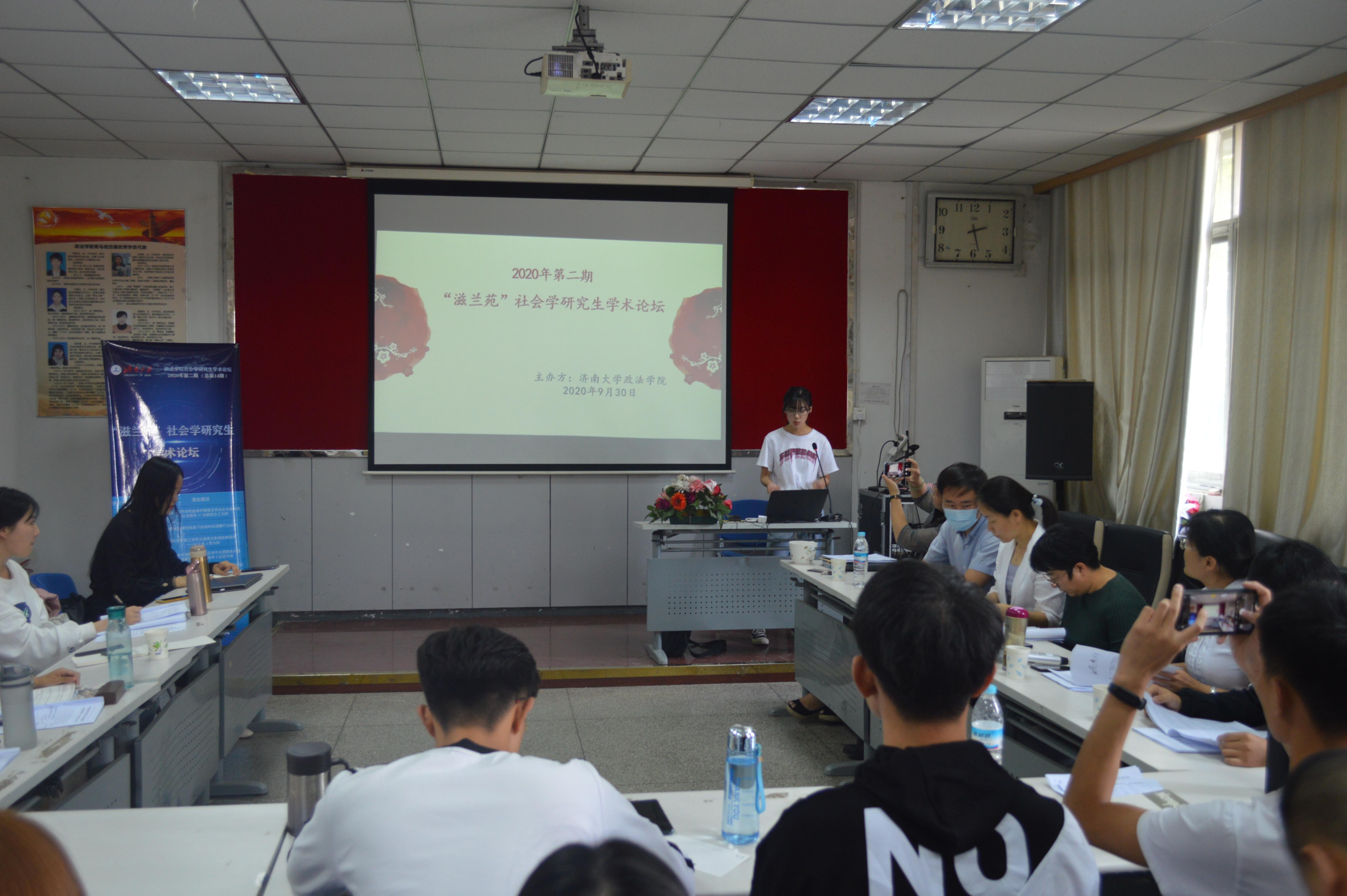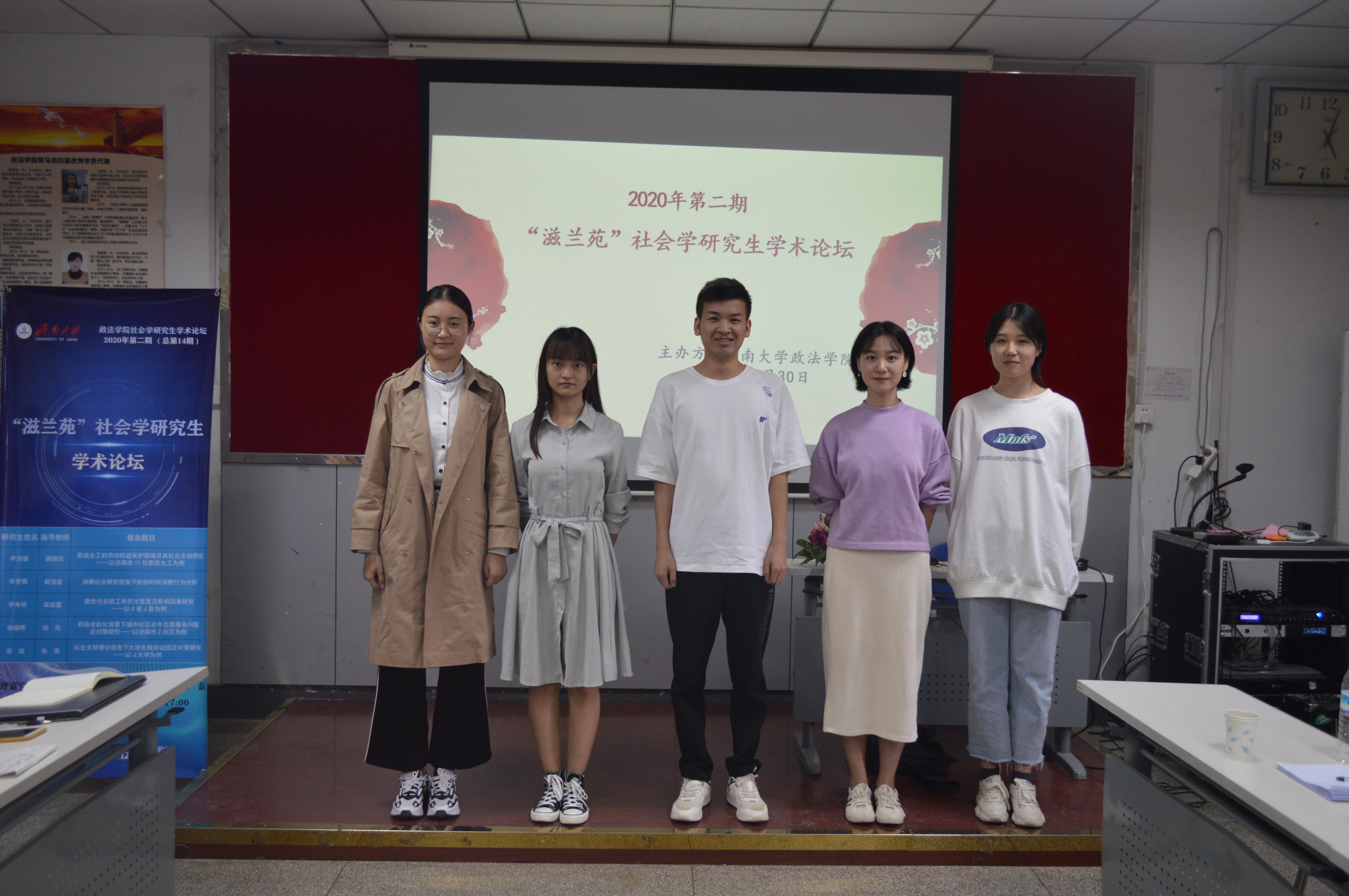 李洁璐、李梦爽、李寿明、徐耀晖、俞璇五位同学分别就题为《家政女工的劳动权益保护困境及社会支持研究——以济南市11位家政女工为例》、《消费社会研究视角下的快时尚消费行为分析》、《新生代农民工市民化意愿及影响因素研究——以G省J县为例》、《积极老龄化背景下城市社区老年志愿者服务问题及对策研究——以济南市Z社区为例》、《社会支持理论视角下大学生网贷动因及对策研究——以J大学为例》的论文进行了PPT展示与分享。六位老师分别从论文选题、结构、文献选择、研究方法、文章内容等方面进行了细致地评价,并给出具体修改建议。针对同学们论文中存在的问题,点评老师提醒各位同学在论文写作过程中要注意研究问题的聚焦,注意社会学理论的正确阐述和研究方法的科学规范,同时要力求表达上的准确恰当。会后,经评委老师投票确定本次论坛的获奖情况为:一等奖:李寿明;二等奖:李璐洁、徐耀晖;三等奖:俞璇、李梦爽。