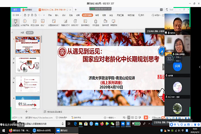 4月10日下午,政法学院“青龙山论坛•线上系列论坛”第二期顺利举行。本次活动邀请北京大学社会学系教授、博士生导师陆杰华,采用腾讯会议直播的方式作了题为《从遇见到远见:国家应对老龄化中长期规划思考》的线上讲座。讲座由政法学院院长梁丽霞主持,同时邀请中国人口学会副会长、南开大学原新教授担当联席主持人,政法学院130余位师生在线参加。