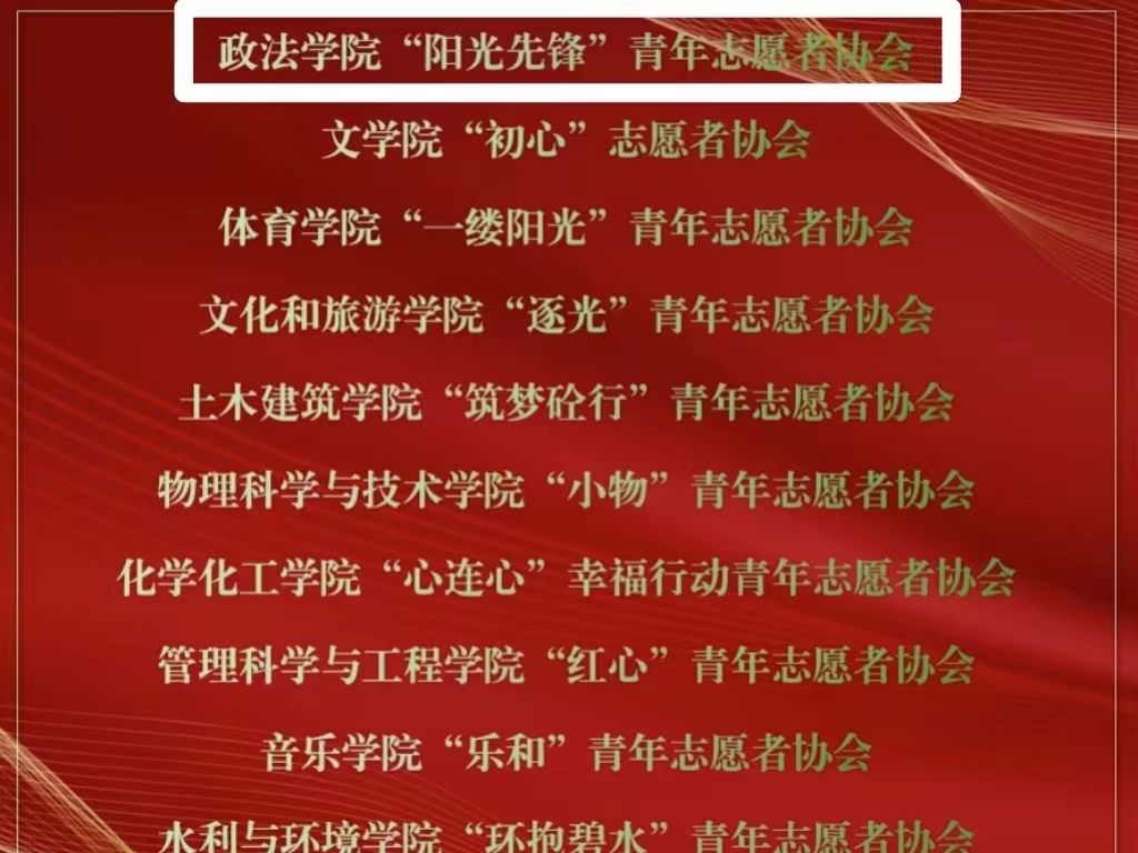 2024年4月,政法学院阳光先锋青年志愿者协会在第二十一届“十佳志愿者服务队”评选工作中荣获“十佳志愿者服务队”称号。主席曲文静在第十八届“十佳志愿者”评选中荣获“十佳志愿者”称号。这一系列的荣誉是对政法学院阳光先锋青年志愿者协会长期以来积极投身志愿服务工作的肯定和赞誉。