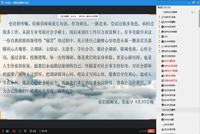 在会议的最后,优秀毕业生兼指导老师张振宇以文字形式向我院学生进行经验交流。他希望大家永葆一颗真实且温暖的心去观察、去调研、去验证、去思考。学社会学,做社会调研,眼观角落,心怀全局,透过表象,挖掘逻辑,每一次的调研,都是亲身体验,更是心路历程,也是人生价值的彰显。愿大家永远铭记最初的自己,怀揣着对社会事实的好奇、对社会群体的温情,涵养人文情怀,把调研做到心间,把论文写到心坎,守住初心,选对人生的方向,抵达心心念念的远方。
