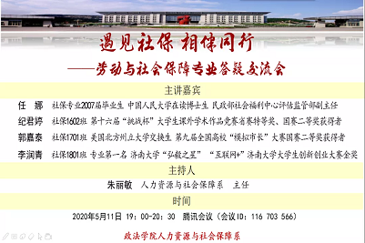 5月11日晚,我院人力资源与社会保障系“遇见社保,相伴同行”劳动与社会保障专业答疑交流会在腾讯会议“云”进行。社保专业2007届毕业生任娜、2018届毕业生杨冠华,社保专业在读本科生1602班纪君婷、1701班郭嘉泰、1801班李润青应邀出席交流会,交流会由人力资源与社会保障系主任朱丽敏老师主持,2019级近百名公共管理大类学生和部分人社系教师参加交流会。