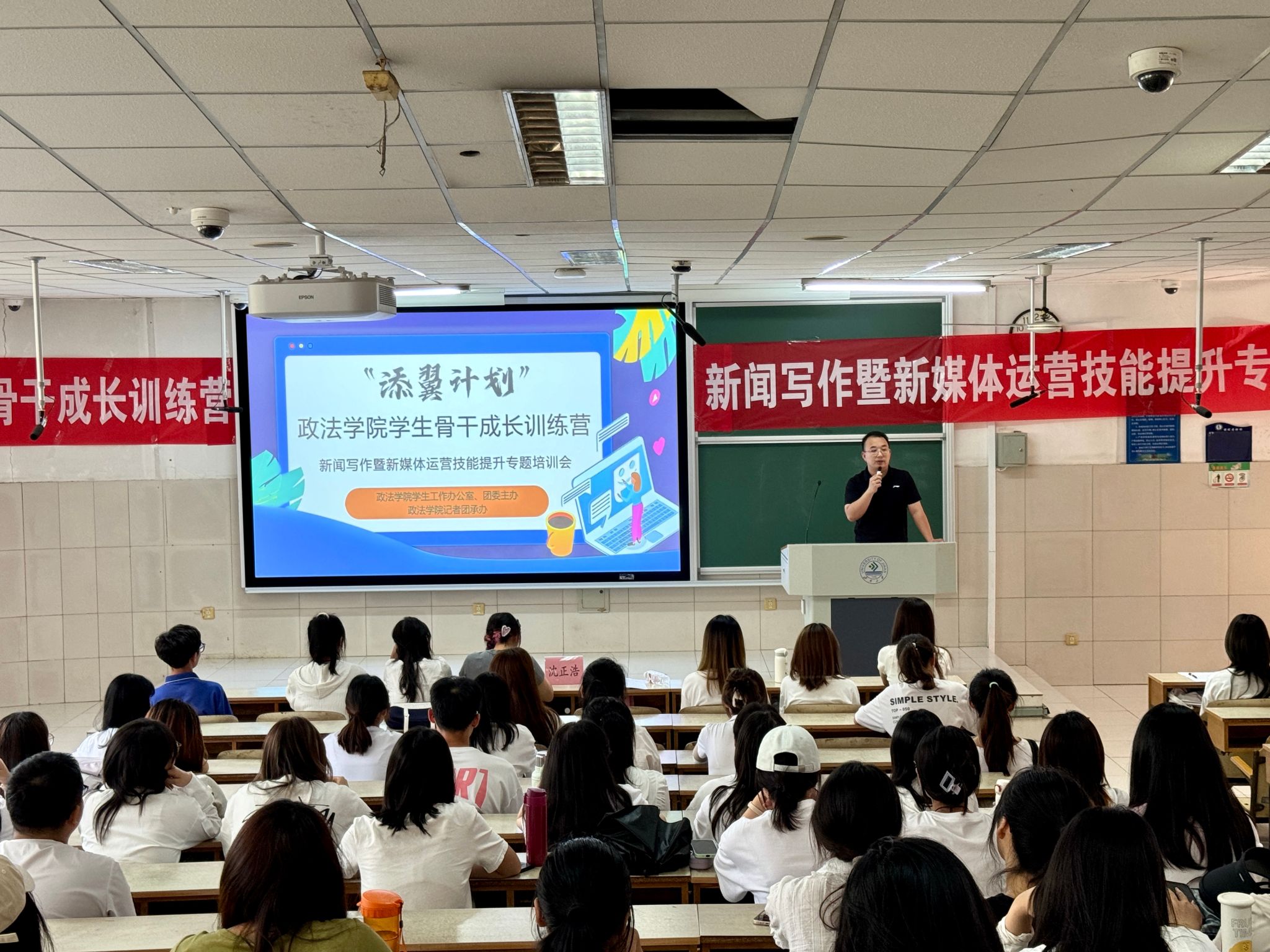 为了强化学院新闻宣传效果,提升学院学生组织专业技能,加强学院新闻宣传工作的传播力、影响力,提升学院舆论宣传工作的有效性。2024年5月28日,由政法学院学生工作办公室、团委主办,学生记者团承办的“添翼计划”学生骨干训练营——新闻写作与新媒体技能专题培训活动成功举办。本次活动特邀校记者团、校融媒体中心部门负责同学作为主讲嘉宾分享新闻采编及推文制作经验,政法学院全体学生组织骨干、各个社团负责同学参加本次培训。