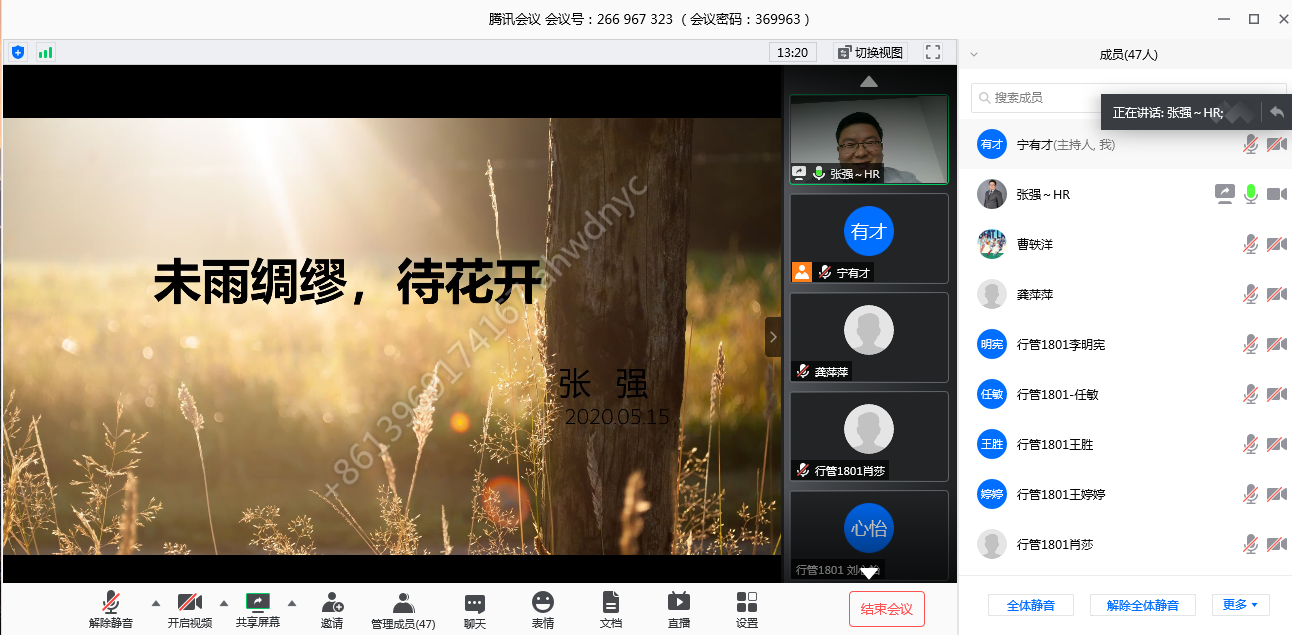5月15日上午,行政管理专业2018级认识实习暨职业发展规划线上辅导系列讲座第四期如期进行。本期辅导讲座很高兴邀请到行政管理专业2008届张强学长,讲座题目是《未雨绸缪待花开》。学院正处级组织员国迎春、行管2018级全体同学、其他年级部分同学在线参加。讲座由宁有才老师主持,采用腾讯会议网络平台。