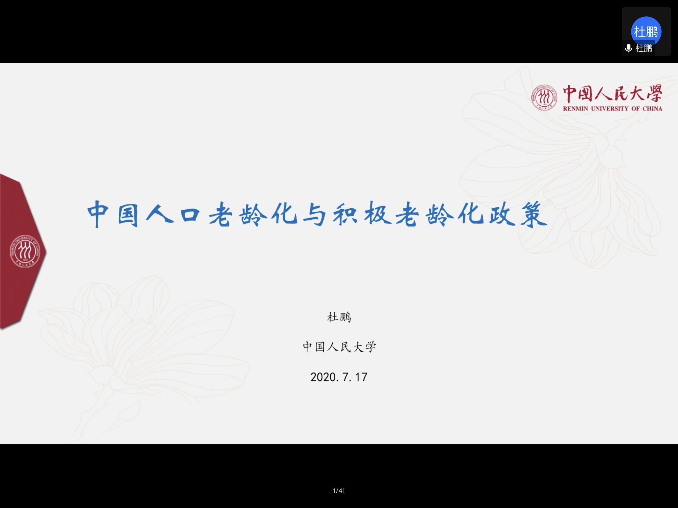 7月17日,政法学院2020暑期系列云讲座首场社会学专场在腾讯会议平台顺利举行。活动邀请中国人民大学副校长、中国人民大学老年学研究所所长杜鹏教授做题为《中国人口老龄化与积极老龄化政策》的专题讲座。讲座由政法学院院长梁丽霞主持,学院师生及相关学者280余人在线参加。