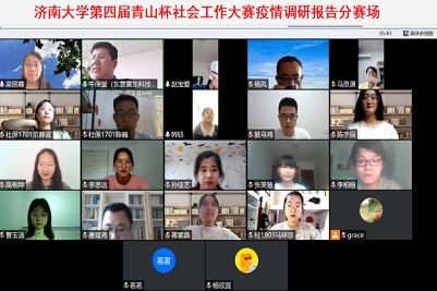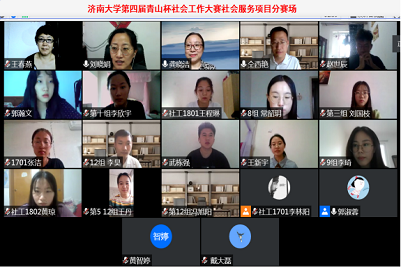 2020年6月23日,济南大学第四届“青山杯”大赛总决赛在“云端”圆满落幕。本次大赛是济南大学“青山杯”社会工作系列大赛的构成部分,也是承办者政法学院在“一支部一品牌、一专业一赛事”育人理念指导下开展的赛事之一。此次大赛共收到104份参赛报名表,有87个团队提交参赛作品,参赛团队来自政法学院、文学院、教育与心理科学学院、商学院、生物科学与技术学院、外国语学院、化学化工学院、材料科学与工程学院等,是济南大学青山杯大赛开赛以来提交作品数最多、覆盖学院最多、竞争最激烈的一届赛事。总决赛分为社会服务项目分赛场、社会工作论文分赛场和疫情调研报告分赛场。