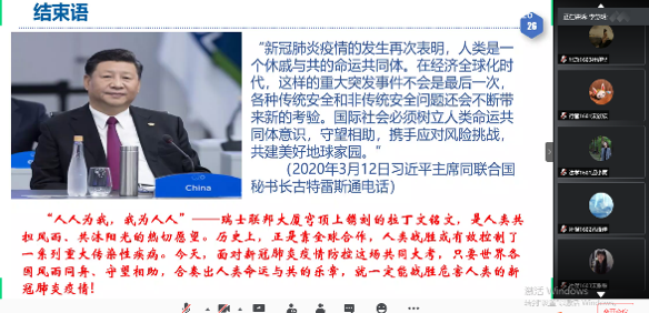 李院长从《新冠疫情冲击下国际关系的震荡与失序》来展开,向党员们讲述了一堂别开生面的专题党课。他讲到在新冠肺炎疫情防控斗争中,我国政府和人民敢于斗争,坚持人民至上,科学防控,加强国际合作,展现的中国精神成为众志成城、共克时艰的力量之本、信心之源,凝聚起抗击疫情的强大精神力量。同时在严峻的疫情面前,国际形势震荡失序,个别政府利用疫情抹黑中国,但合则两利、斗则俱伤,合作是唯一正确的选择,双方应共同努力,加强抗疫等领域的合作,共同抗击新冠疫情带来的影响。党员们纷纷表示,听了这次专题党课,进一步激发了自己报效祖国、奉献社会的信心和决心。