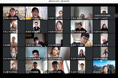 为拓宽防疫期间师生交流渠道,持续抓好学生思想教育管理工作,更好地服务学生成长,切实解决学生提出的疑难困惑。尽可能减少疫情对教学活动、学生学业的影响。2020年4月17日,济南大学政法学院通过视频会议形式举行了以“师生‘心’连线,对话‘云’相聚”为主题的线上师生面对面交流活动。党委书记徐庆国,院长梁丽霞,正处级组织员国迎春,党委副书记、副院长于龙泉、副院长李慧明、刘康磊,学办教办负责人及各年级辅导员老师出席此次活动。师生共六十余人展开了一次轻松愉悦的“云”相聚,活动由学办主任黄茜老师主持。