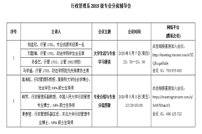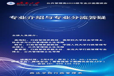 为进一步帮助2019级公共管理类新生更深入了解和认识专业,助力做好专业选择,行政管理系近期举行两场专业辅导会:一场是邀请高年级优秀学生做“大学生活与专业学习漫谈”分享会,发挥朋辈榜样作用;另一场是邀请专业教师做“专业介绍与专业分流答疑”辅导会,提升专业认知和答疑解惑。两场辅导会均通过腾讯会议网络平台进行。2019级公共管理类全体同学、学院正处级组织员国迎春和行政管理系部分老师线上参加,会议由宁有才主持。