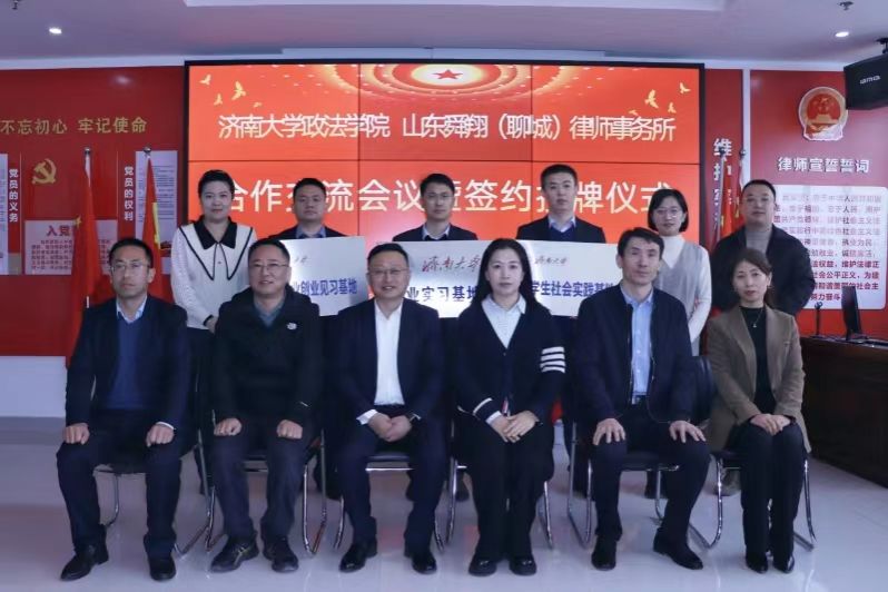 为进一步落实“百校访万企”促就业行动,足质足量、精准有效开展访企拓岗,1月13日上午,政法学院与山东舜翔(聊城)律师事务所举行合作交流会议暨签约授牌仪式。政法学院党委书记李春慧,党委副书记、副院长李涛,法学系主任刘康磊,学生工作办公室主任黄茜,团委书记刘晓娟,辅导员沈正浩,山东舜翔(聊城)律师事务所主任王衍康,副主任郭延宽、钟玉鹏、丁燕、张建升、李强参加了仪式。仪式由李强主持。