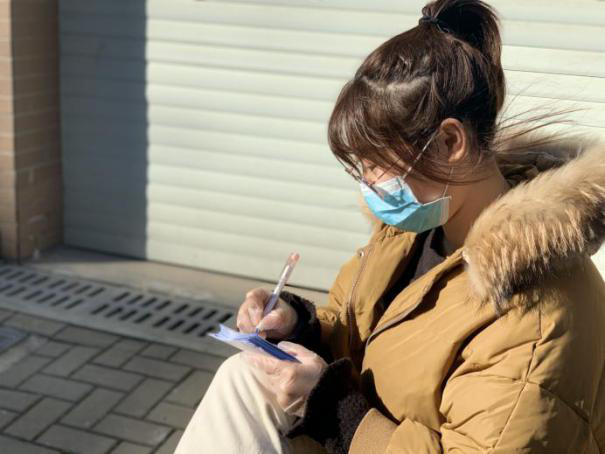 8.社会工作1801班的王莹,家住济南市市中区青桐山村,并于2月1日自愿报名成为疫情防卫工作站的一名志愿工作人员,每天的12:00-15:00是工作时间,穿上马甲,戴上口罩,在村口疫情防卫工作点值班,为来往的车辆与人员做好登记。