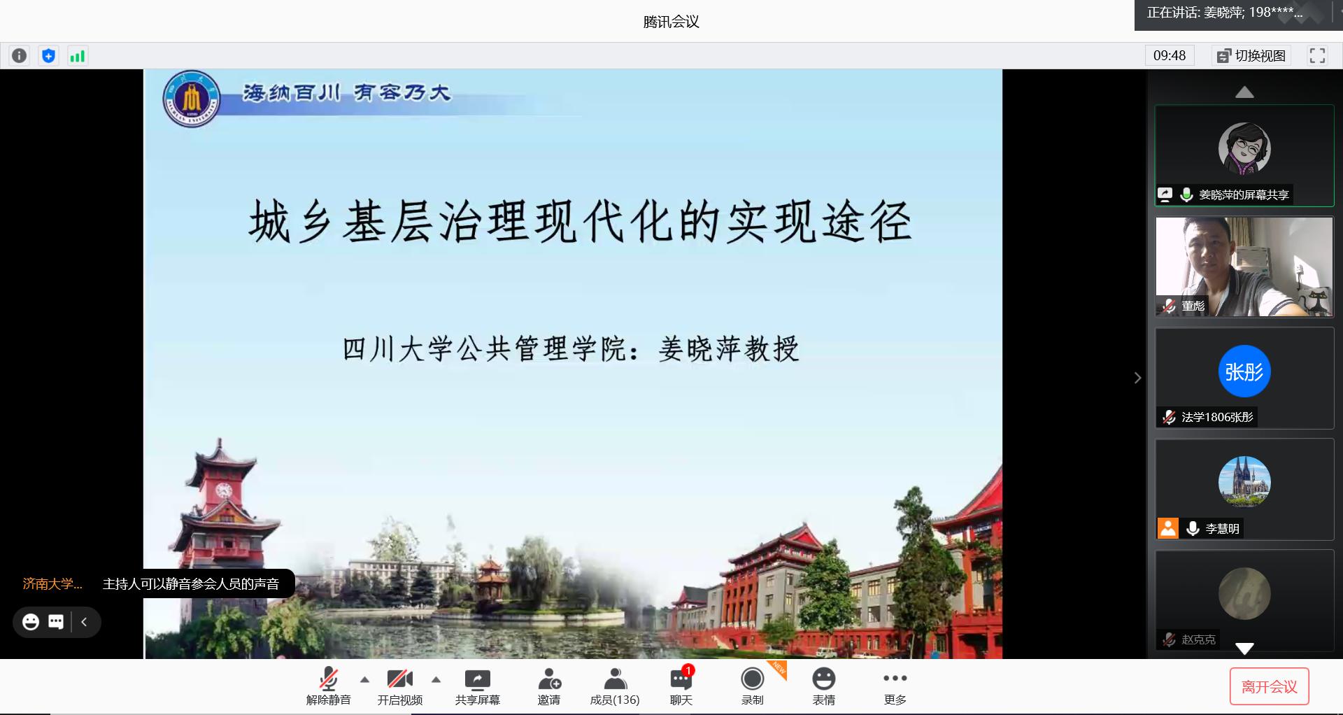 8月28日,我院2020暑期系列云讲座第九期在腾讯会议平台顺利举行。活动邀请四川大学城市治理研究院院长姜晓萍教授做题为《城乡基层治理现代化的实现途径》的主题讲座。讲座由政法学院副院长李慧明教授主持,学院师生及相关学者140余人在线参加。