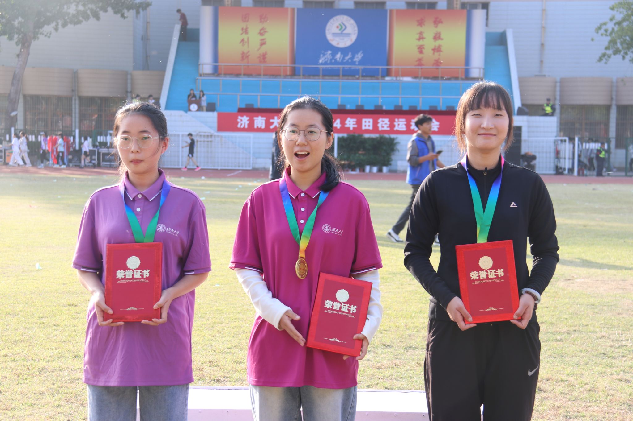 2024年10月25日,济南大学2024年运动会女子学生组1500米决赛在同学们的热烈期盼中隆重开启。我院龚钰灵、黄颖和宁云菲三位同学在比赛中展现出惊人的毅力与坚韧,其中黄颖同学荣获第五名,宁云菲凭借卓越表现一举夺得冠军。
