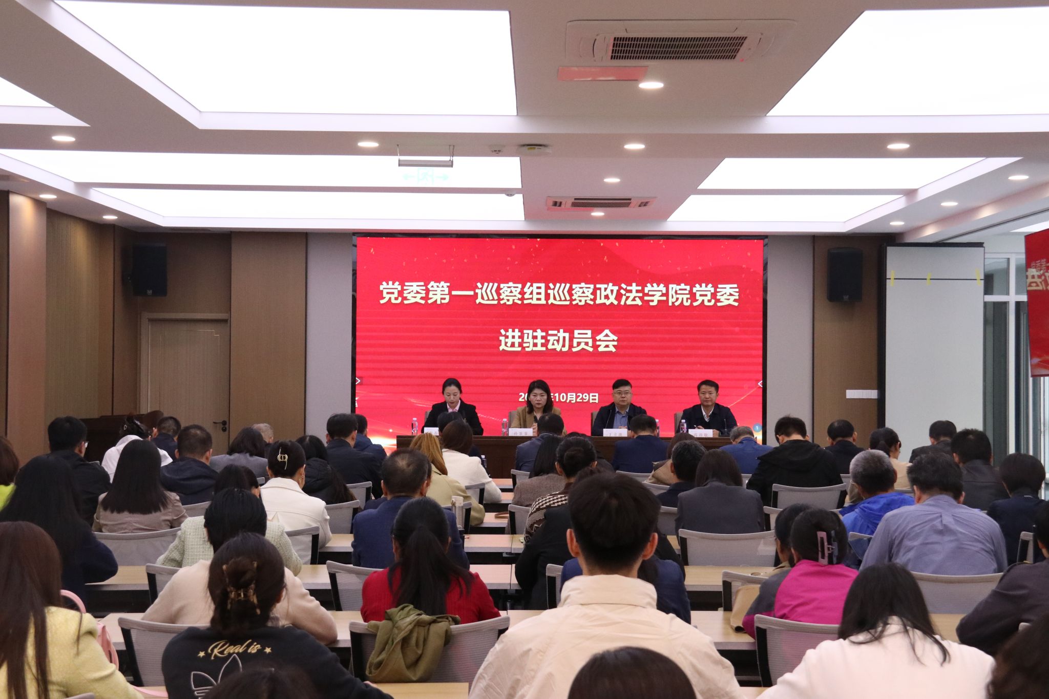 按照学校党委巡察工作统一部署,10月29日下午,济南大学党委第一巡察组巡察政法学院党委进驻动员会在学校第五学术报告厅召开。学校党委巡察工作领导小组成员、纪委副书记孙菲菲,党委第一巡察组组长丁立波及巡察组全体成员,政法学院全体教职工、部分学生代表参加会议。会议由政法学院党委书记李春慧主持。