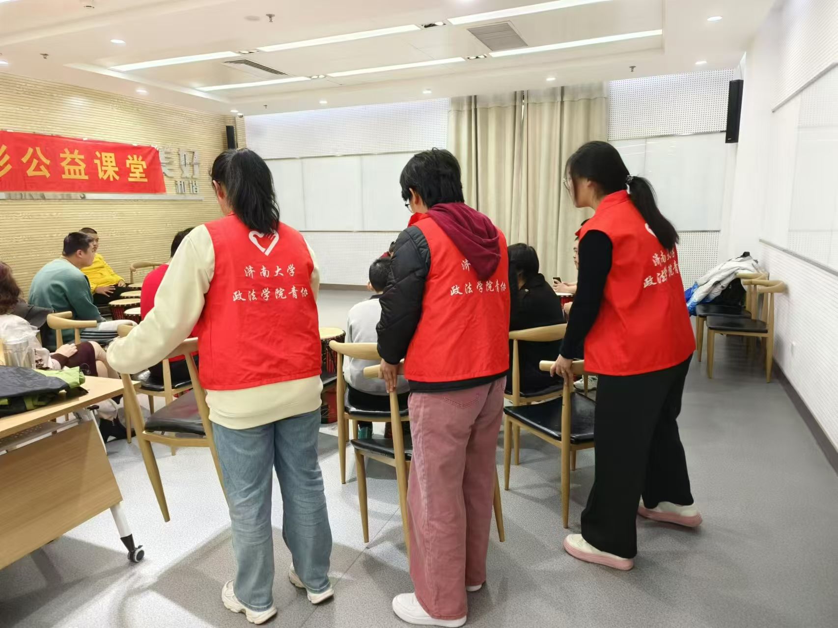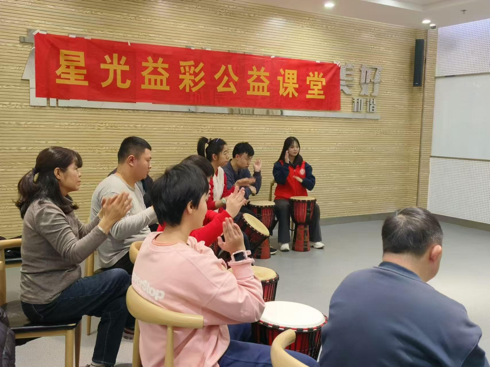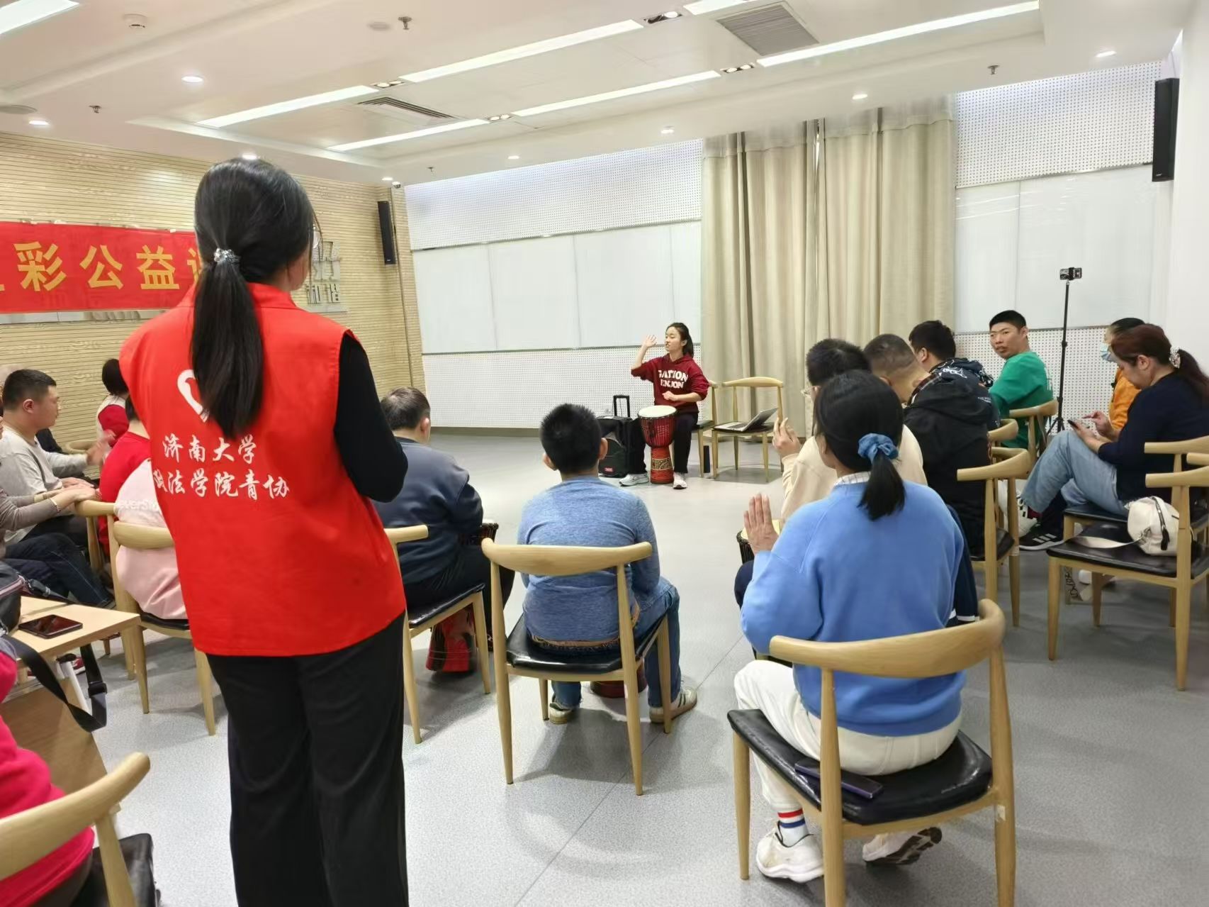 “音乐是灵魂的完美展现。”为给残障人士提供自我展示和接触艺术的机会,促进他们情感和心灵的健康发展,政法学院阳光先锋青年志愿者协会的志愿者于2024年11月9日前往济南市慧爱残疾人服务中心的星光艺彩公益课堂开展了一场非洲鼓公益课程,以提高残障人士的音乐技能,助力他们更好地融入社会。