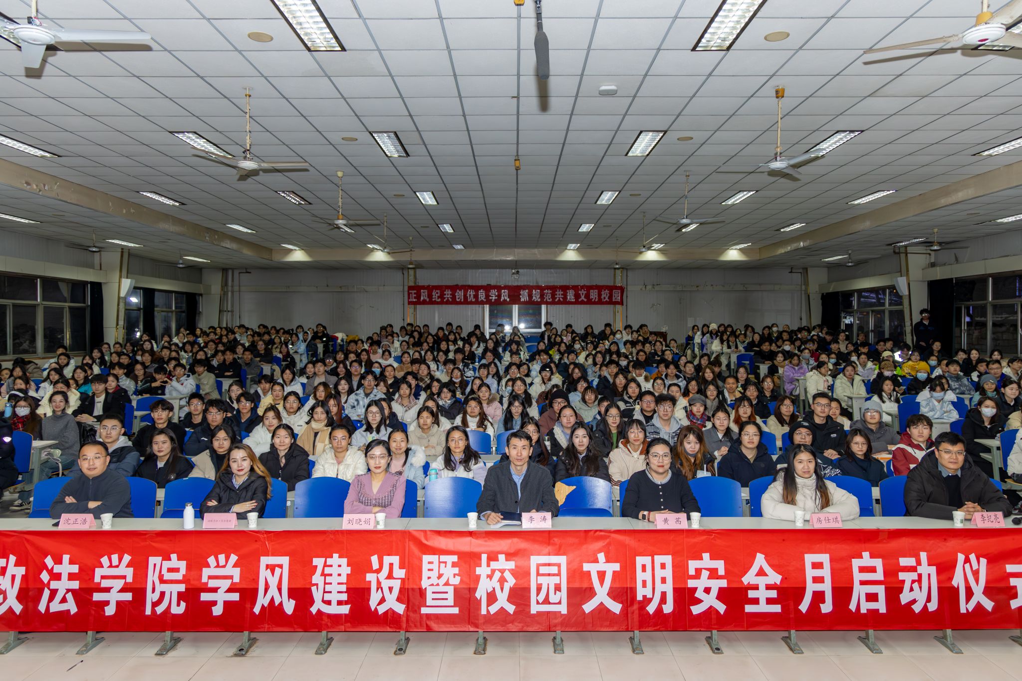 为强化学风建设,筑牢安全之基,增进学生自我管理、应急应变能力,营造勤勉向学、安全稳定的浓郁氛围。2024年12月11日19点,政法学院在星硕教室举行“学风建设暨校园文明安全月”启动仪式。学院党委副书记、副院长李涛,学生工作办公室全体辅导员老师,学院全体学生干部,全体学生党员参加此次活动。