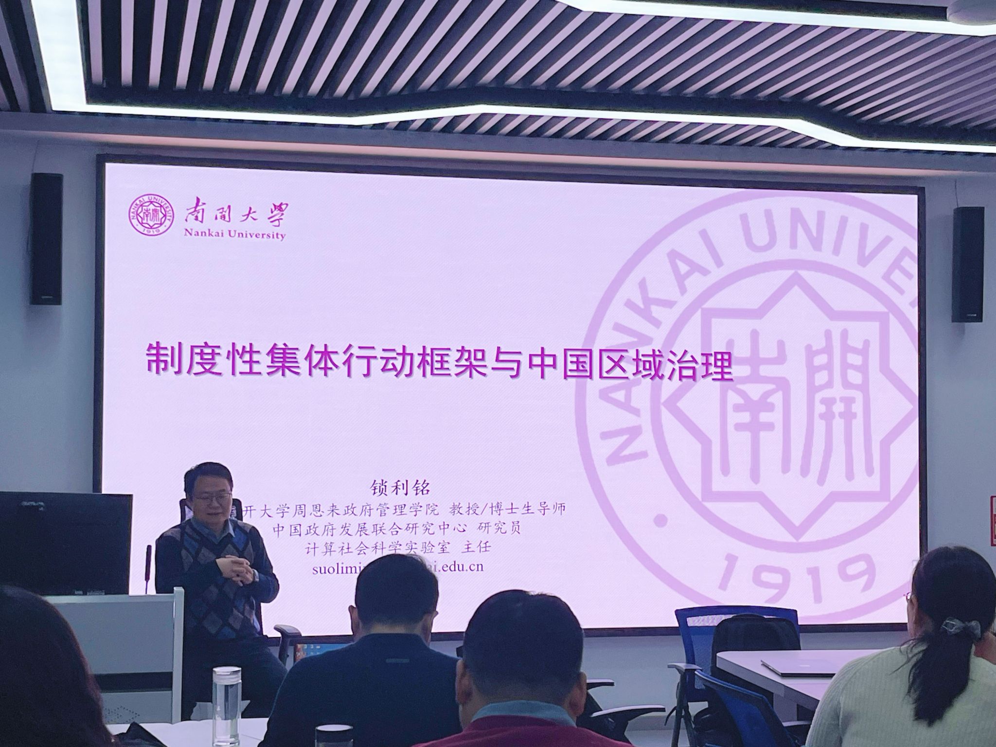 12月22日上午,济南大学政法学院青龙山学术论坛在四教413教室成举行。南开大学周恩来政府管理学院博士生导师锁利铭教授作了题为《制度性集体行动框架与中国区域治理研究》的学术报告及国家社科基金申报经验分享。报告由社科处处长、政法学院院长高功敬教授主持,政法学院师生共计60余人参加。