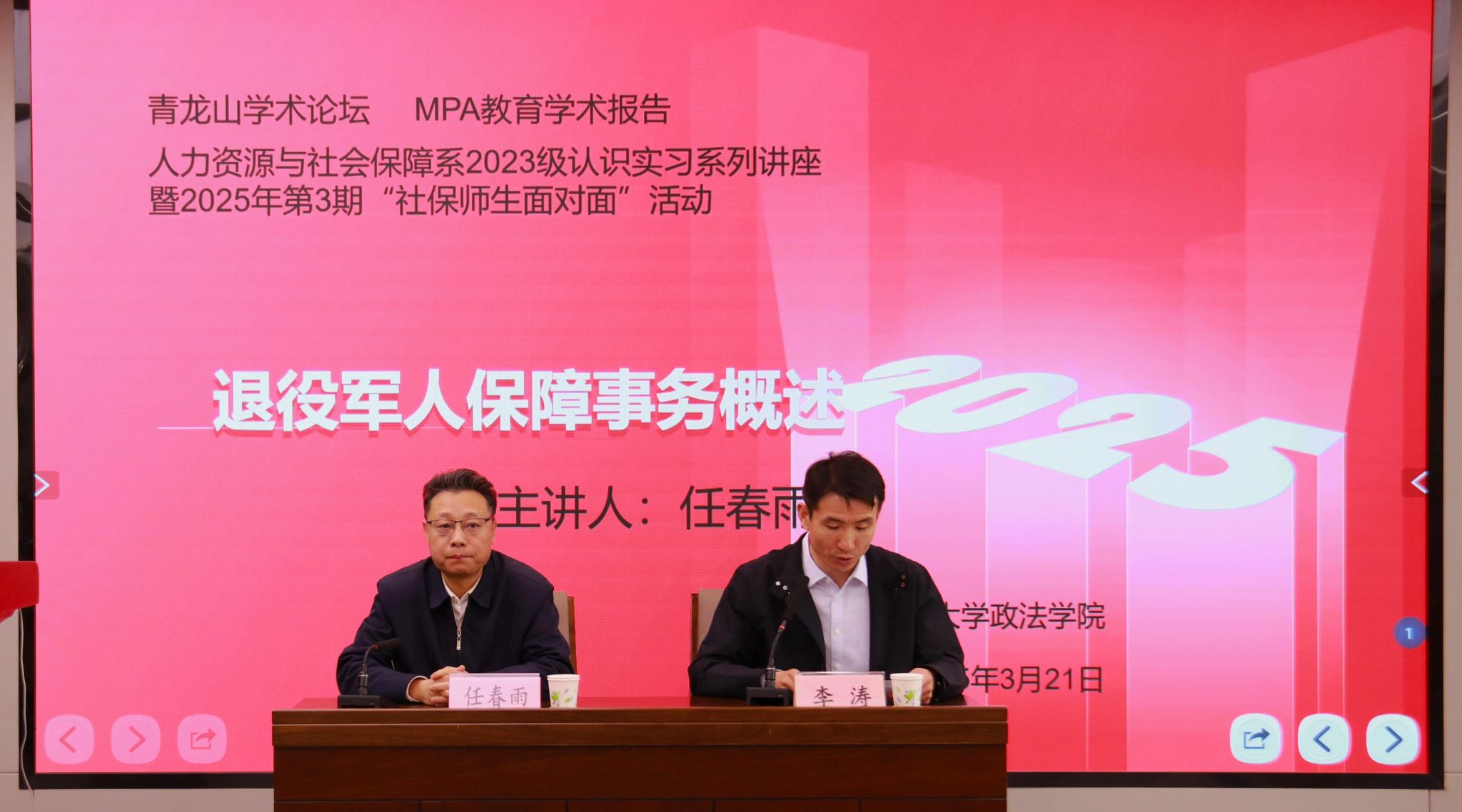 3月21日上午,我院于第五学术报告厅举办了青龙山论坛暨人力资源与社会保障系2023级认识实习系列讲座,这也是2025年第3期“社保师生面对面”活动。本次活动有幸邀请到济南市退役军人事务局副局长任春雨,进行退役军人事务相关讲座。参加此次讲座的包括人力资源与社会保障系部分教师、2023级人社系本科生,以及部分专业的研究生。