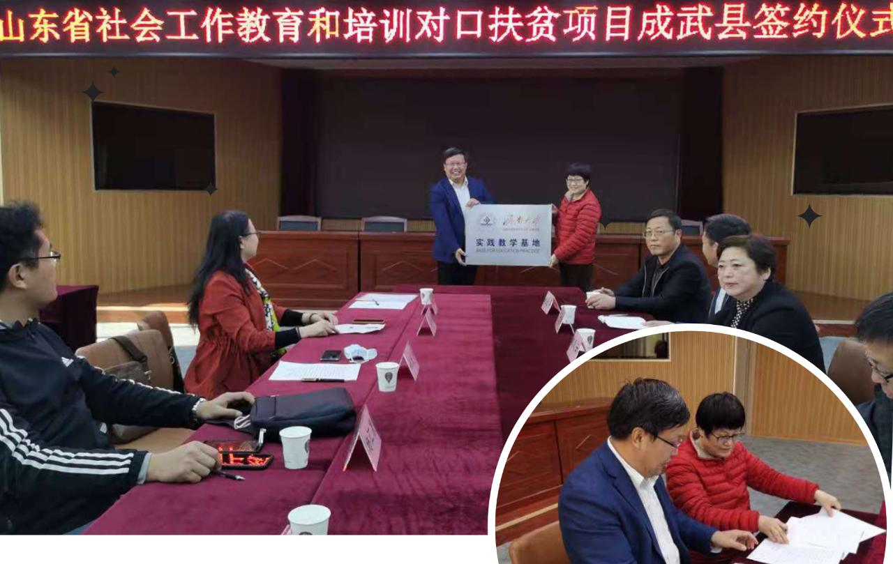 为落实和贯彻《山东省民政厅 山东省财政厅 山东省扶贫办关于支持社会工作专业力量参与脱贫攻坚的实施意见》,2020年11月7日,济南大学政法学院与成武县民政局在菏泽市成武县联合举办“山东省社会工作教育和培训对口扶贫项目成武县签约仪式暨座谈会”。