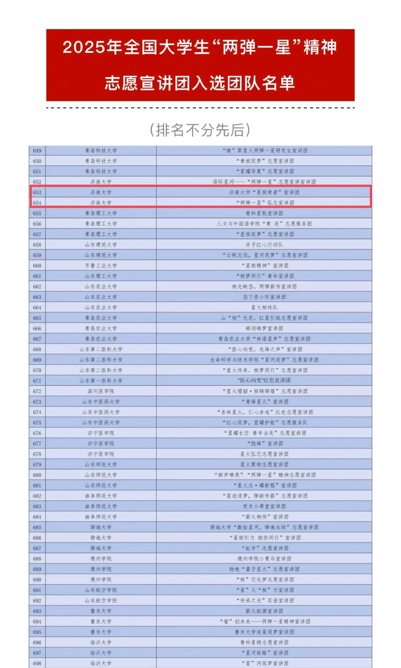 全国大学生“两弹一星”精神志愿宣讲活动旨在引导新时代广大青年学生坚定爱国报国信念,大力弘扬与传承“两弹一星”精神。活动吸引了全国1123所高校的5680支团队踊跃参与,遴选出1500支“两弹一星”精神志愿宣讲服务团队。济南大学政法学院“星核使者”宣讲团、“两弹一星”弘志宣讲团成功入选。