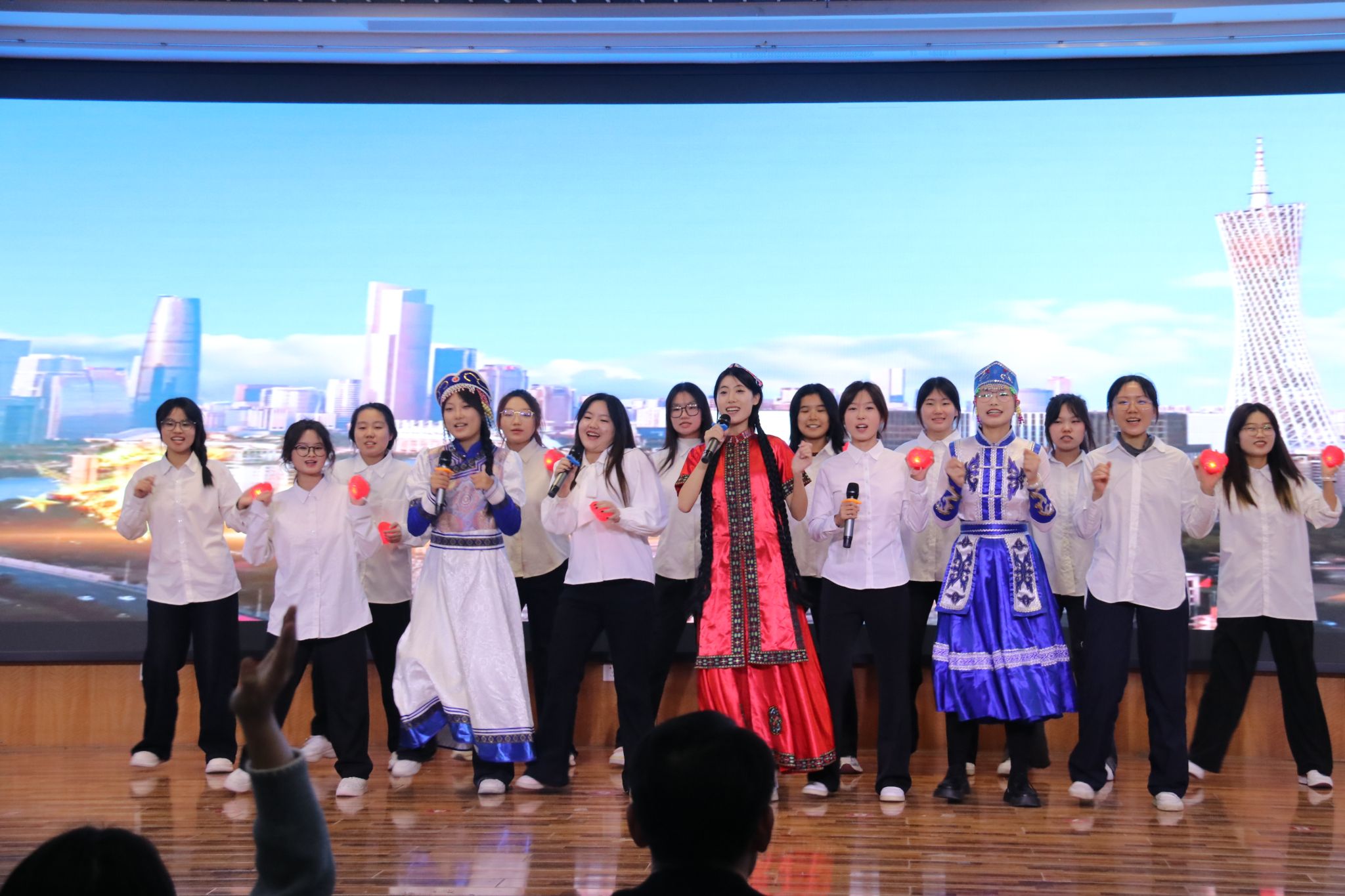决赛还设置了学院各学生组织带来的文艺节目环节,学生会带来的串烧歌曲《追梦》作为开场节目,惊艳亮场;心协带来的情景剧《民族情·剧暖心》从校园日常到历史瞬间,让我们感受各民族跨越时空的深厚情谊;青协献上节目《舞韵诵心·歌聚今朝》,当音符落下,舞姿定格的时刻,大家心中充满团结的温暖与激昂;记者团准备的手势舞《石榴籽·同心谣》,指尖传递温暖,手势里的民族团结情更打动人心;最后由自律会带来的一首耳熟能详的《相亲相爱》,唱出了大家庭的温暖,汇聚了各族师生携手并肩的深厚情谊。每一段舞蹈、每一首歌曲都是对民族文化的深情致敬,也是对民族团结的热烈颂扬。