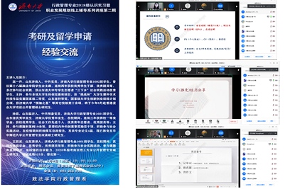 5月8日上午,行政管理专业2018级认识实习暨职业发展规划线上辅导系列讲座第二期如期进行。本次讲座邀请了行政管理专业毕业班高一丹、孙霞和王若溪三位学姐,她们分享的题目是《考研及留学申请经验交流》。政法学院正处级组织员国迎春、行管2018级全体同学、其他年级部分同学在线参加。讲座由宁有才老师主持。