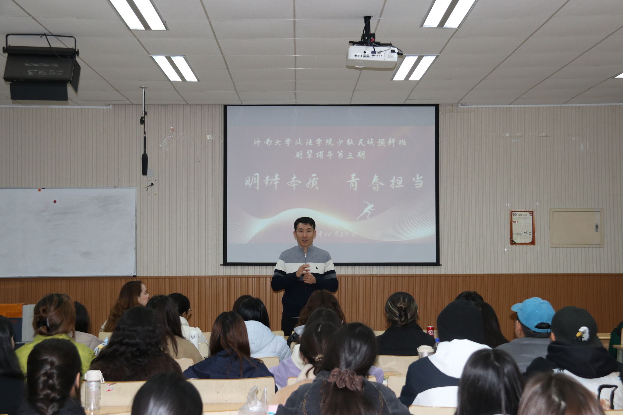 为进一步引导青年学生树立正确的国家观、民族观、宗教观、历史观和文化观,增强学院少数民族学生安全意识,筑牢校园安全防线,深化“五个认同”,防范抵御“三股势力”渗透侵蚀。2025年11月27日,政法学院开展以“明辨本质,青春担当”为主题的安全教育活动,市中区公安局王建国主任、学院党委副书记李涛、学院少数民族专职辅导员迪妮尕尔·艾尔夏提、预科班全体学生、学院各年级少数民族学生代表参与活动。