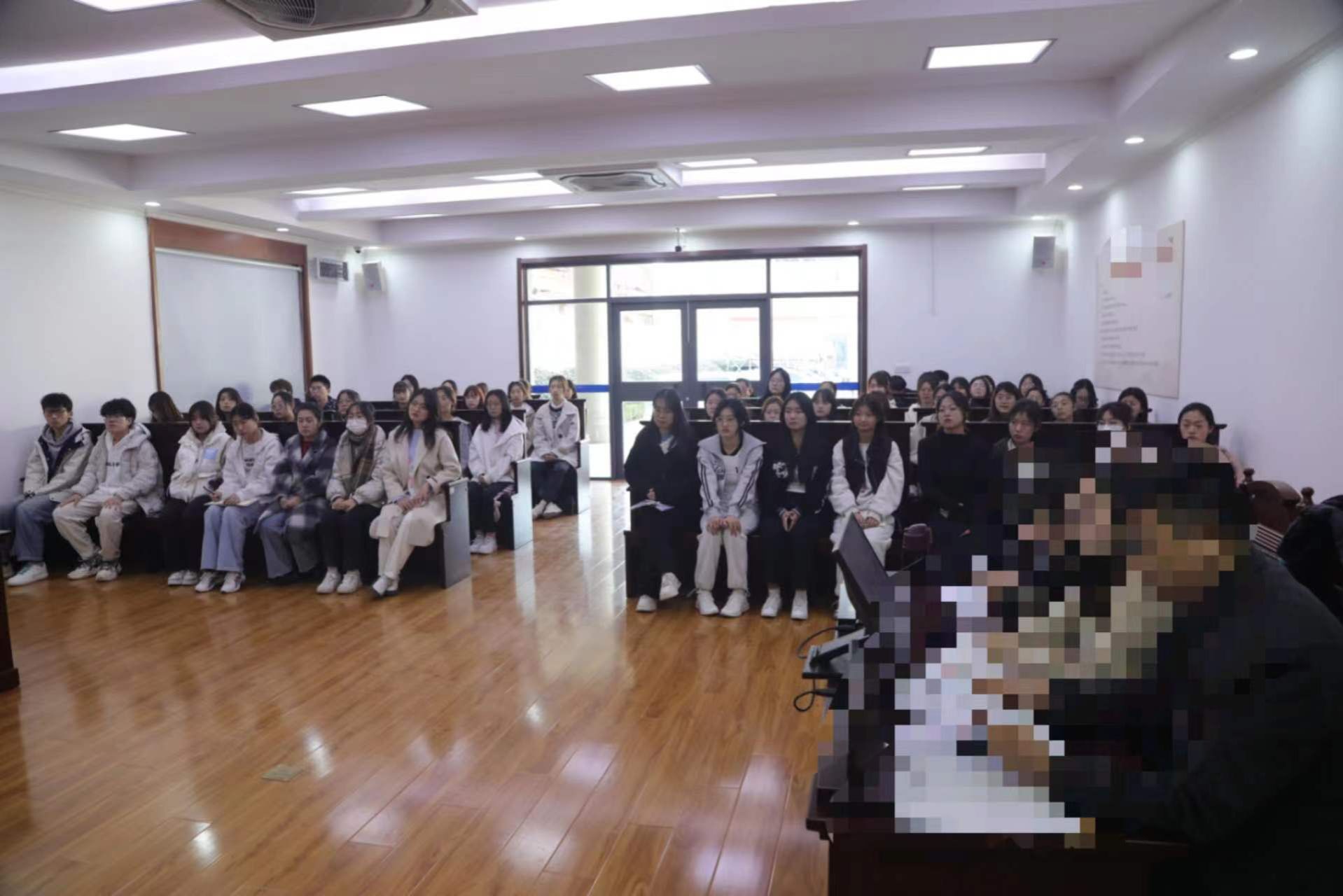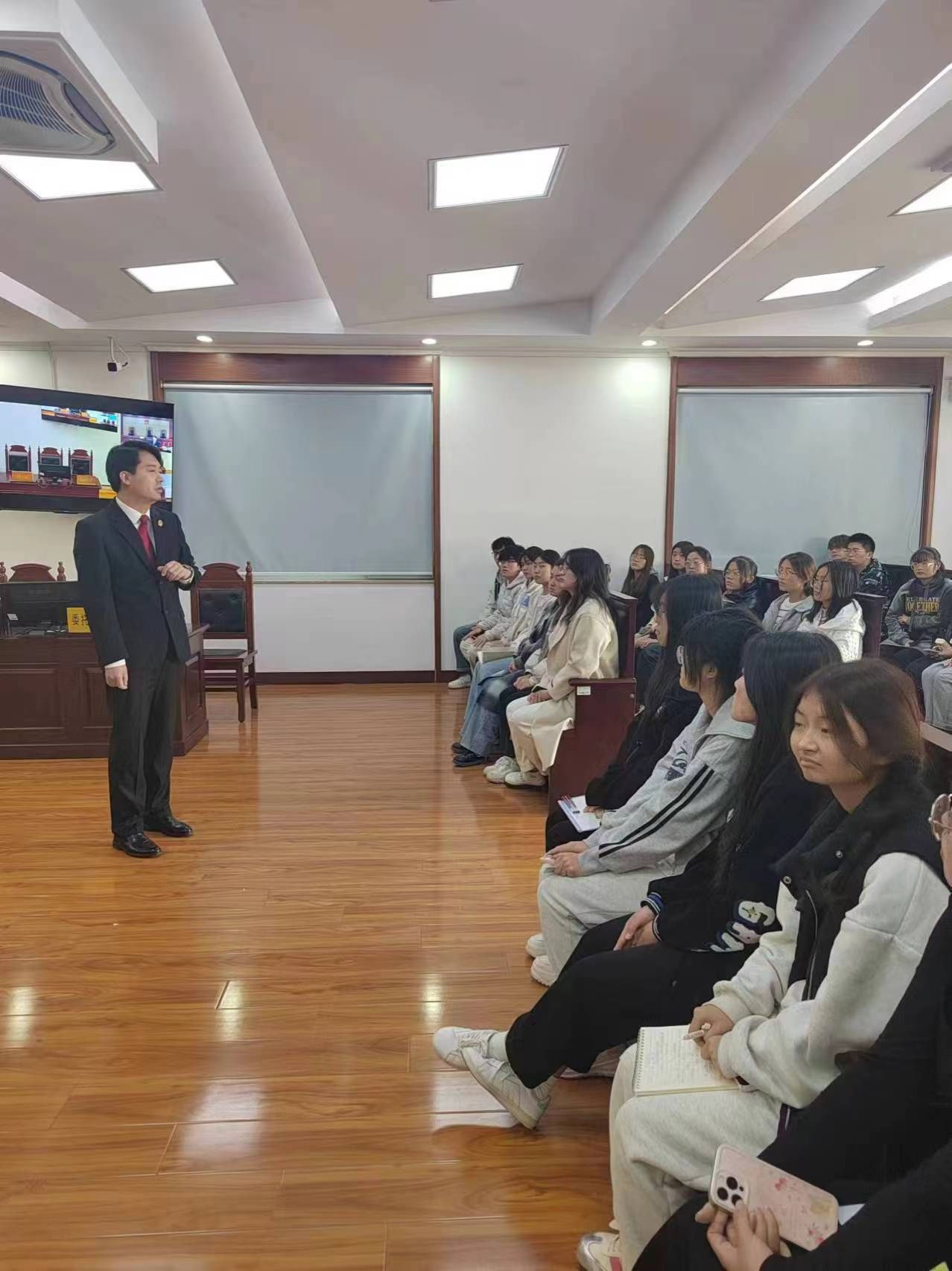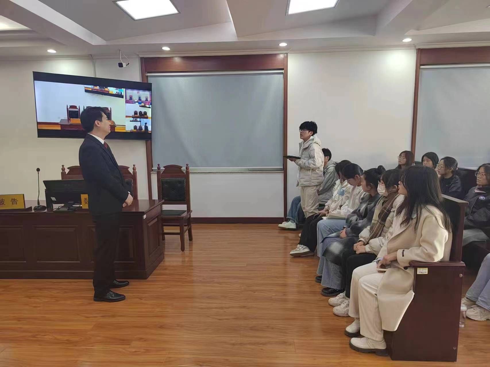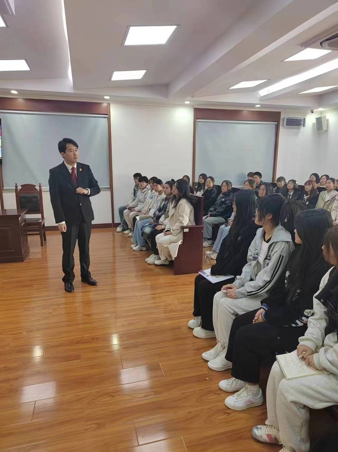 2024年3月12日下午,济南大学政法学院法学2022级、2023级本科生共同参加了市中区人民法院七贤法庭举行的法庭旁听活动,让同学们深刻感受到了法律的神圣不可侵犯。学生们对此次旁听活动充满期待,做了充分的准备。在开庭的前三十分钟,卢娜法官带领同学们在法庭门口与法院工作人员合影留念,随后学生们就整齐有序地排队进入审判庭安静等待开庭。首先,赵同庆法官为我们讲述了案件的概要,此次庭审是有关生命权、健康权的案件,基本案由是原告的父亲在被告的疗养院因异物堵塞食道导致窒息死亡,且疗养院采取的急救措施不正确,导致原告的父亲错过最佳抢救时机。在庭审过程中,学生们服从法庭指挥,遵守法庭礼仪,不仅全神贯注地听审判的全过程,还奋笔疾书地记笔记。庭审结束后,赵同庆法官组织同学们在审判厅召开座谈会,几位同学积极的问问题,有学业上不懂的问题,还有对庭审过程中的疑问等,赵同庆法官一一为同学们答疑解惑。随后,卢娜法官带领同学们参观了法庭文化历史长廊、法院各部门的工作室以及法官的办公区域。最后,赵同庆法官和卢娜法官积极邀请学生们前往七贤法庭实习,学生们都感觉收获满满。
