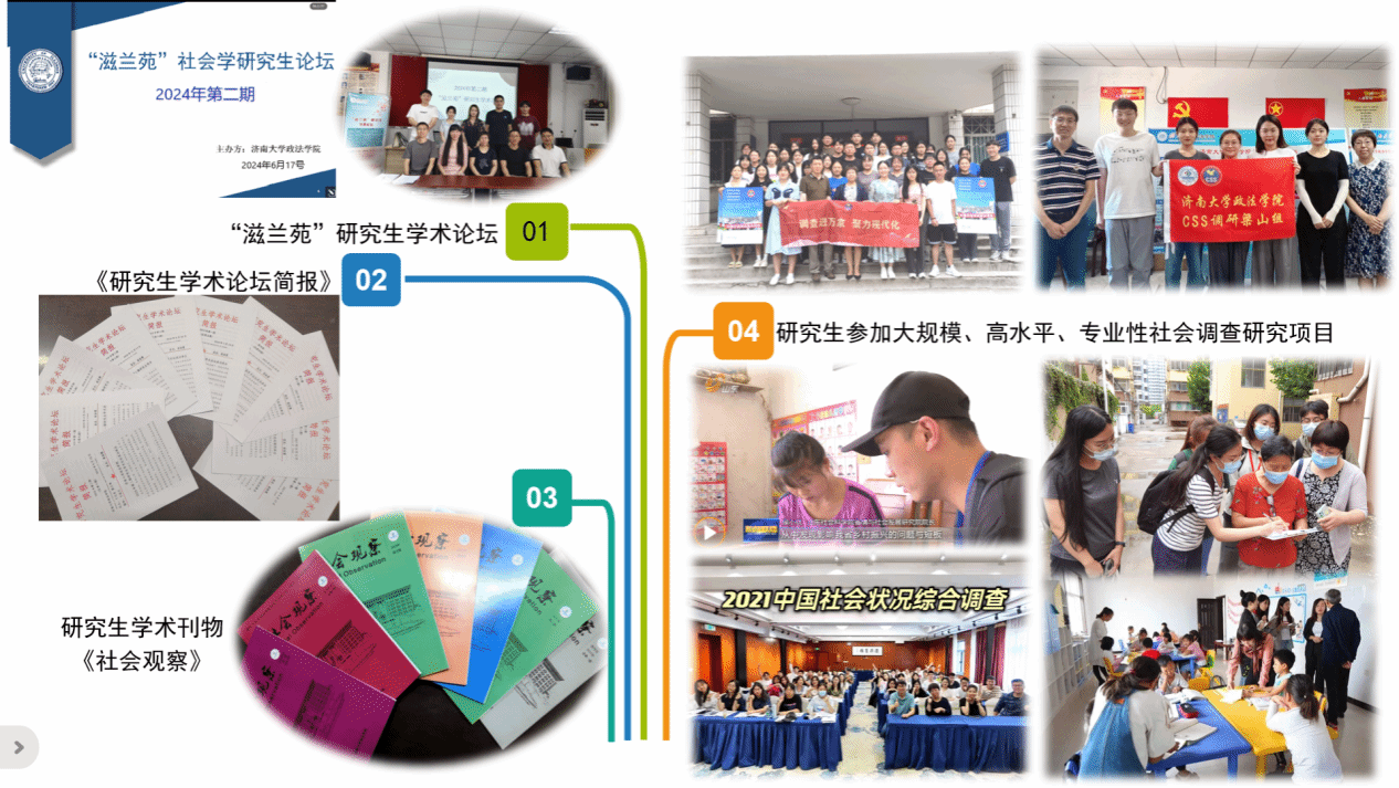 连续举办“滋兰苑”社会学研究生学术论坛并编印《研究生学术论坛简报》,定期出版研究生学术刊物《社会观察》;组织承办一系列大规模、高水平、专业性社会调查研究项目,为研究生提供丰富多彩的专业性社会调查实践机会。