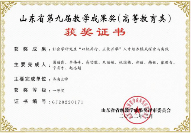 ◎建立起社会学研究生“双轨并行、五化并举”的人才培养模式,该教改成果获山东省第九届教学成果一等奖