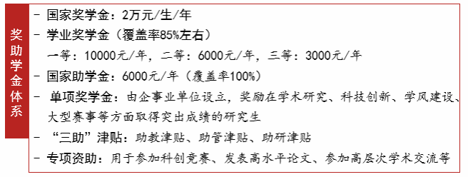 奖助学金制度健全,设立国家奖学金、学业奖学金、国家助学金、单项奖学金、“三助”津贴等。学院专门出台《研究生教育质量提升计划与实施办法》,对研究生参与科创竞赛、发表高水平论文、参加高层次学术交流等给予大力资助与支持。