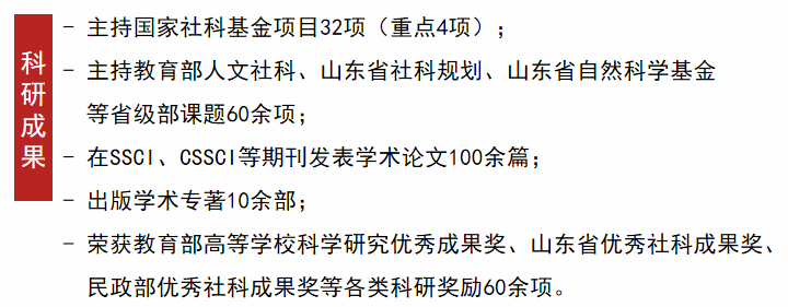 近年来教师承担国家社科基金近50项(重点项目5项),省部级项目100余项,到账纵向、横向科研经费2000余万元;发表高水平论文300余篇,出版学术著作20余部;科研成果获教育部高等学校科学研究优秀成果奖1项,山东省社科优秀成果奖一等奖6项、二等奖10余项,其他省部级奖励20余项。承担国家级、省级和校级一流本科课程、精品课程、课程思政示范课程等20余门,出版教材20余部,获省级优秀教学研究成果奖6项。在校学生获国家级奖励20余项,省部级等奖项百余项。