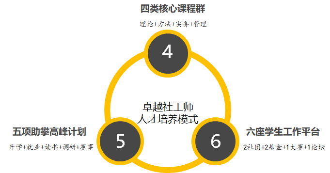为培养卓越社会工作师人才,本学位点经过长期探索和创新实践,建立起 “456”卓越社会工作师人才培养模式,即4类核心课程集群、5项助攀高峰计划、6座学生工作平台,全面助力学生综合能力的提高。