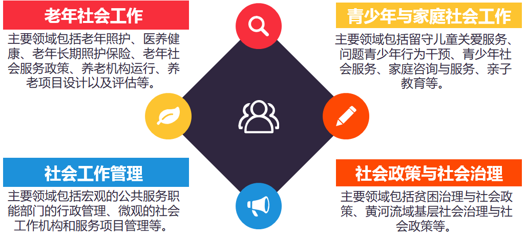 本学位点设有4个特色培养方向:老年社会工作 、青少年与家庭社会工作、社会工作管理、社会政策与社会治理。
