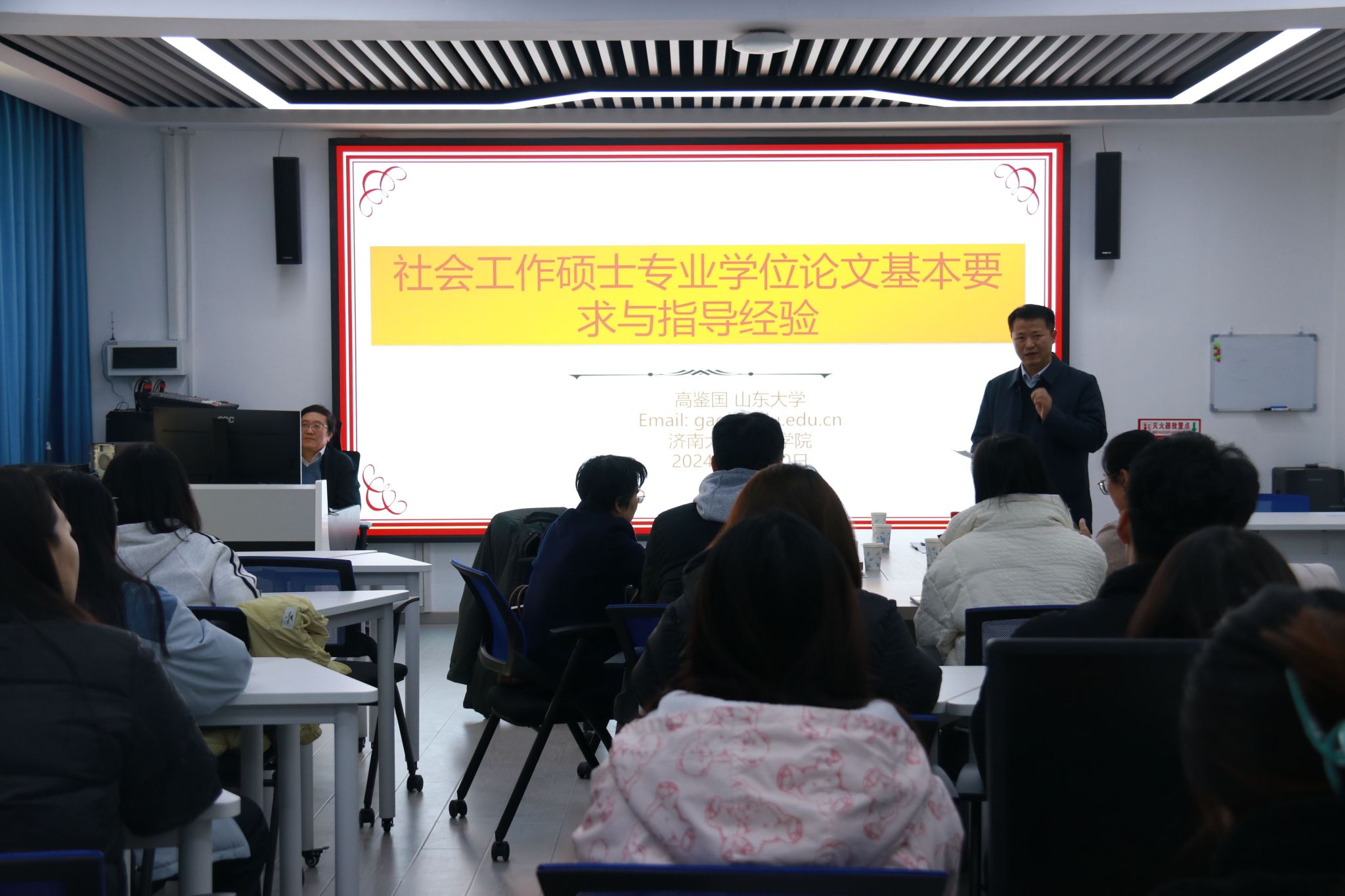 12月10日下午14:30,济南大学政法学院青龙山学术论坛在四教413教室成功举办。此次学术论坛特邀山东大学哲学与社会发展学院社会工作系博士生导师高鉴国教授作题为《社会工作硕士专业学位论文基本要求与指导经验》的学术报告。报告由社科处处长、政法学院院长高功敬教授主持,学院师生共计60余人参加。