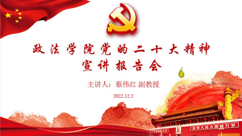 根据学校《关于深入学习宣传贯彻党的二十大精神的通知》有关要求和《政法学院党委学习宣传贯彻党的二十大精神实施方案》,12月2日,政法学院党委邀请马克思主义学院蔡伟红副教授为学院全体党员师生开展党的二十大精神宣讲,宣讲会由学院党委书记徐庆国主持。