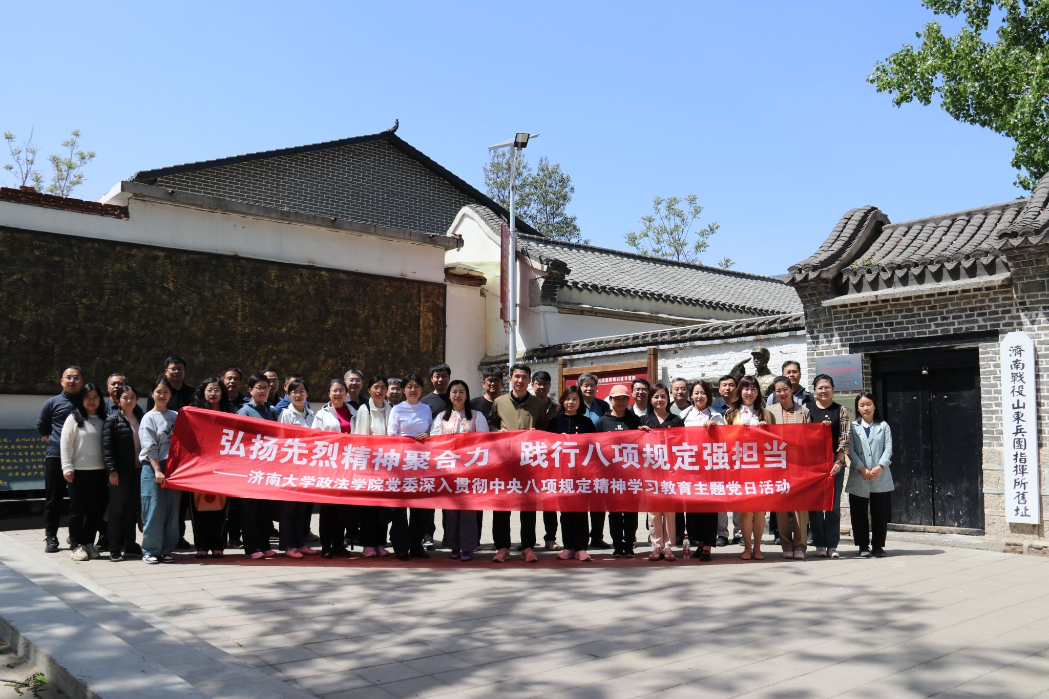 为扎实开展深入贯彻中央八项规定精神学习教育,缅怀革命先烈,传承红色基因,凝聚奋进力量,4月15日,政法学院党委赴济南战役山东兵团指挥所旧址开展“弘扬先烈精神聚合力 践行八项规定强担当”学习教育主题党日活动。学院领导班子成员,各党支部书记、委员,教师党员代表参加活动。