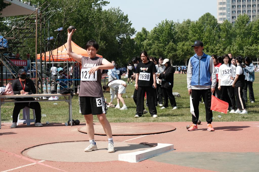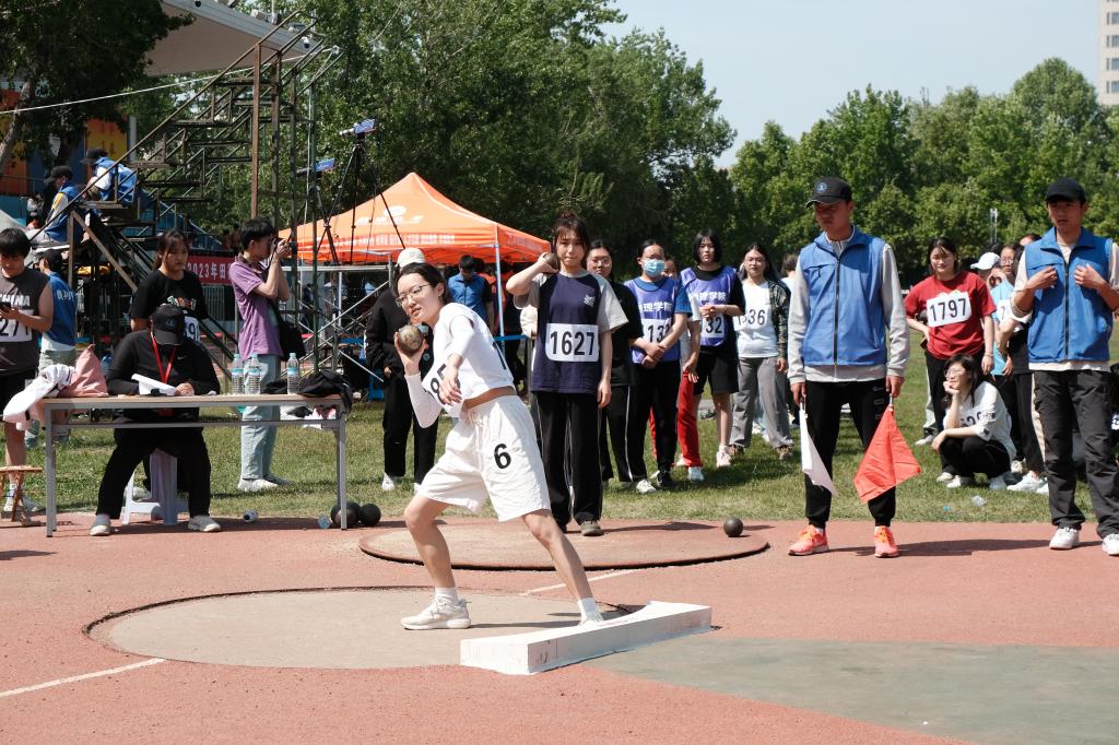 比赛开始前,陈一诺同学提前到场适应场地,进行热身和投掷技巧的简单练习,为接下来的正式比赛做最后的准备工作。不多时,其他运动员陆续入场,王月、万一阳同学也调整好状态,蓄势待发,满怀信心准备迎接比赛。比赛正式开始,选手依次上场投掷,片刻后裁判员下达上场指令,伴随场周观众的欢呼,陈一诺同学深吸一口气,手握铅球目光坚定,她将铅球平稳举至肩膀,轻呼一口气,闭目沉心,再睁眼,没有丝毫犹豫,右臂发力点停,投掷而出,干净利落。铅球在空中划过一道优美的弧线,观众们目光聚焦,只见铅球滞空一瞬后稳稳落地,场面气氛有片刻凝滞,在看清成绩后又即刻爆发出热烈的欢呼声。最终经过裁判裁定,我院陈一诺同学以9米75的好成绩成功获得本次学生组铅球比赛的第一名。