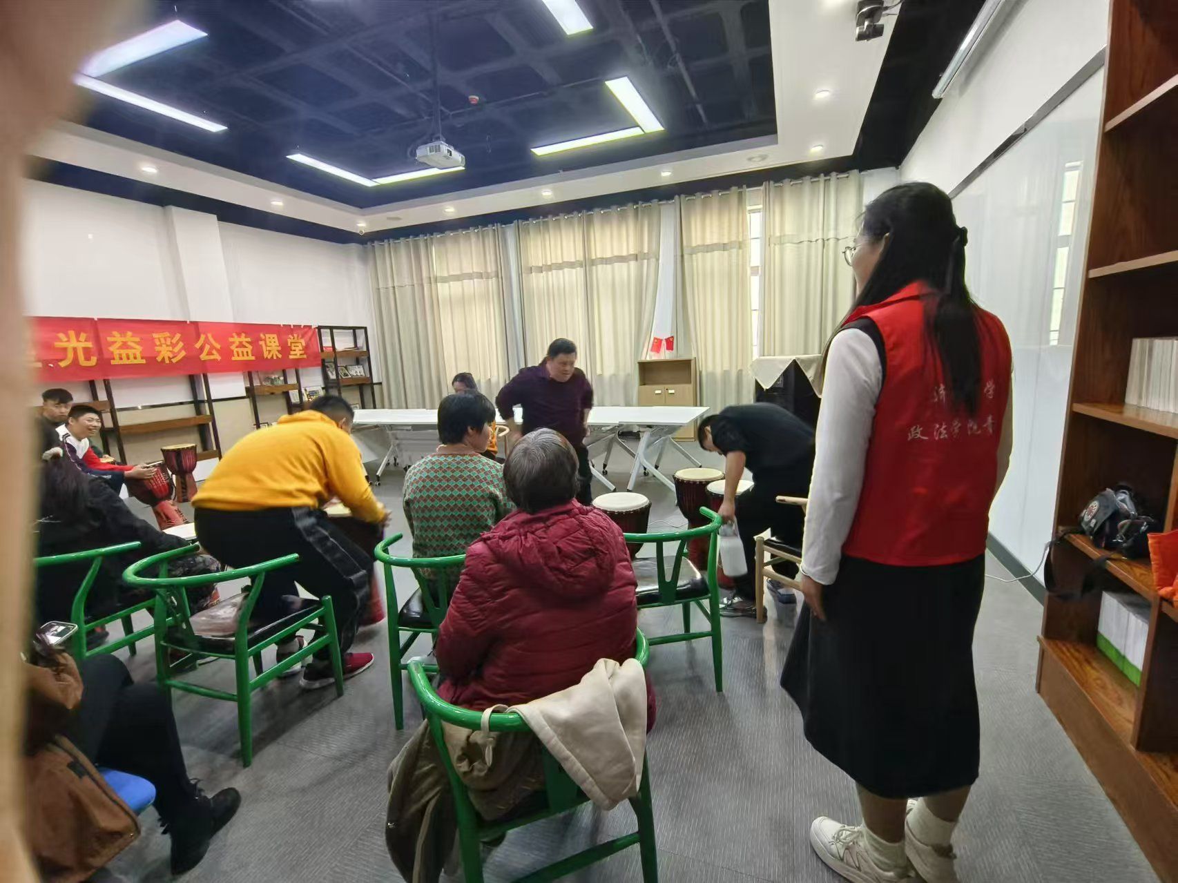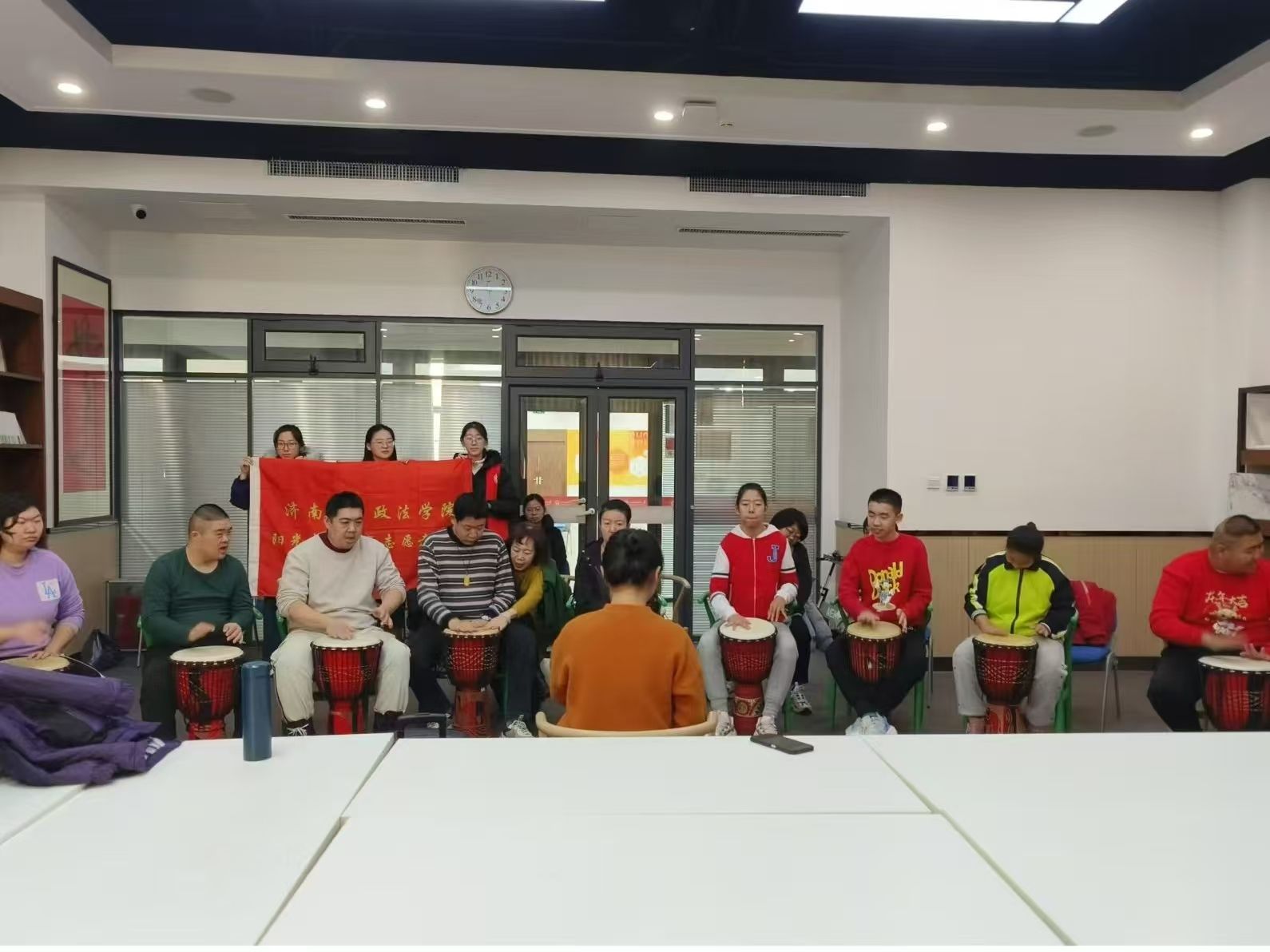 “音乐是灵魂的语言。”2024年11月30日,政法学院阳光先锋青年志愿者协会(以下简称“政法青协”)于济南市慧爱残疾人服务中心的星光艺彩公益课堂成功举办了一场非洲鼓公益教学活动,旨在提升残疾人朋友的语言表达能力、情绪管理与社交技巧,并丰富其精神文化生活。