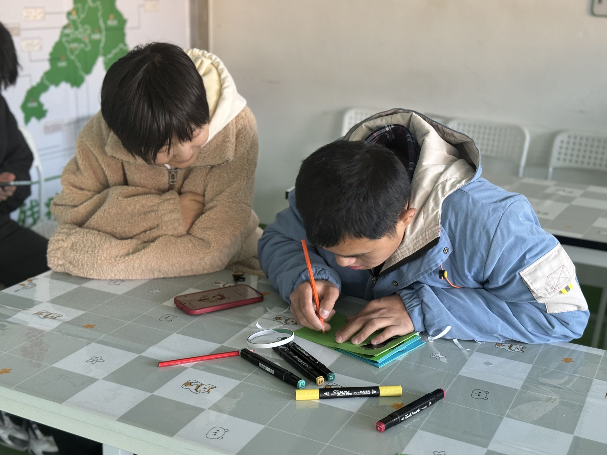 活动当天,为了调动孩子们的积极性,志愿者们与孩子们一起裁剪、涂鸦,制作出意义非凡的手工照片册。在制作风琴样式的相册的过程中,志愿者们与孩子们坐在一起,耐心教导他们使用手工工具的方法。空气中洋溢着温馨的氛围,志愿者们将在基地拍下的纪念照片打印出来,和孩子们一起将照片粘贴在相册上。志愿者们帮助孩子们以绘画的形式丰富相册的内容,整个过程生动有趣。在最后的环节,孩子们与志愿者互动的瞬间定格在照片中,活动在欢声笑语中落下帷幕。