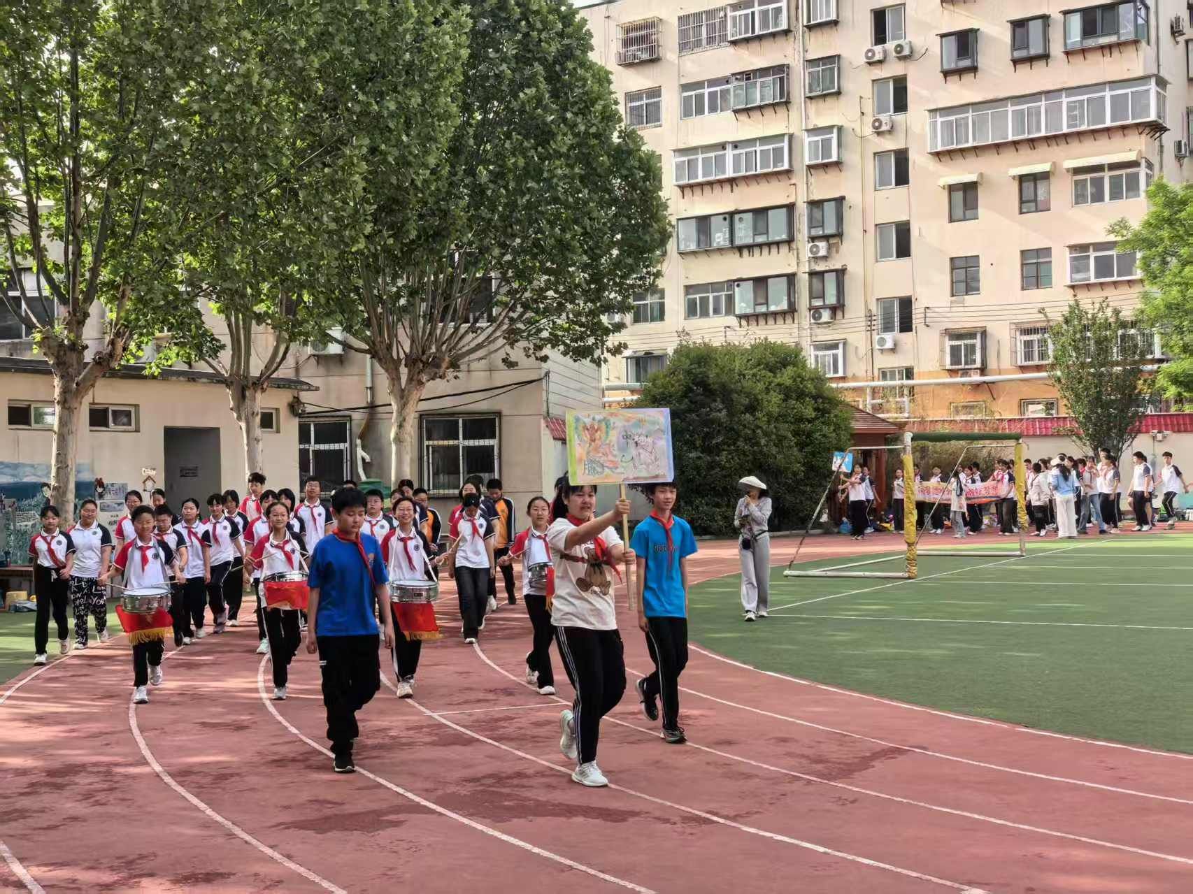 清晨的操场已是一片忙碌景象,我院社工实习生们与教师们早早投入赛场布置,从赛道标线到器材摆放,每一个细节都倾注了他们的细致与热情。随着玉函小学校长刘然、党委副书记韩常霞致辞,开幕式在庄严的国歌声中正式启动。各年级方阵踏着铿锵的步伐入场,整齐的队列、创意的口号、挥舞的彩旗,无不彰显少年们的蓬勃朝气。