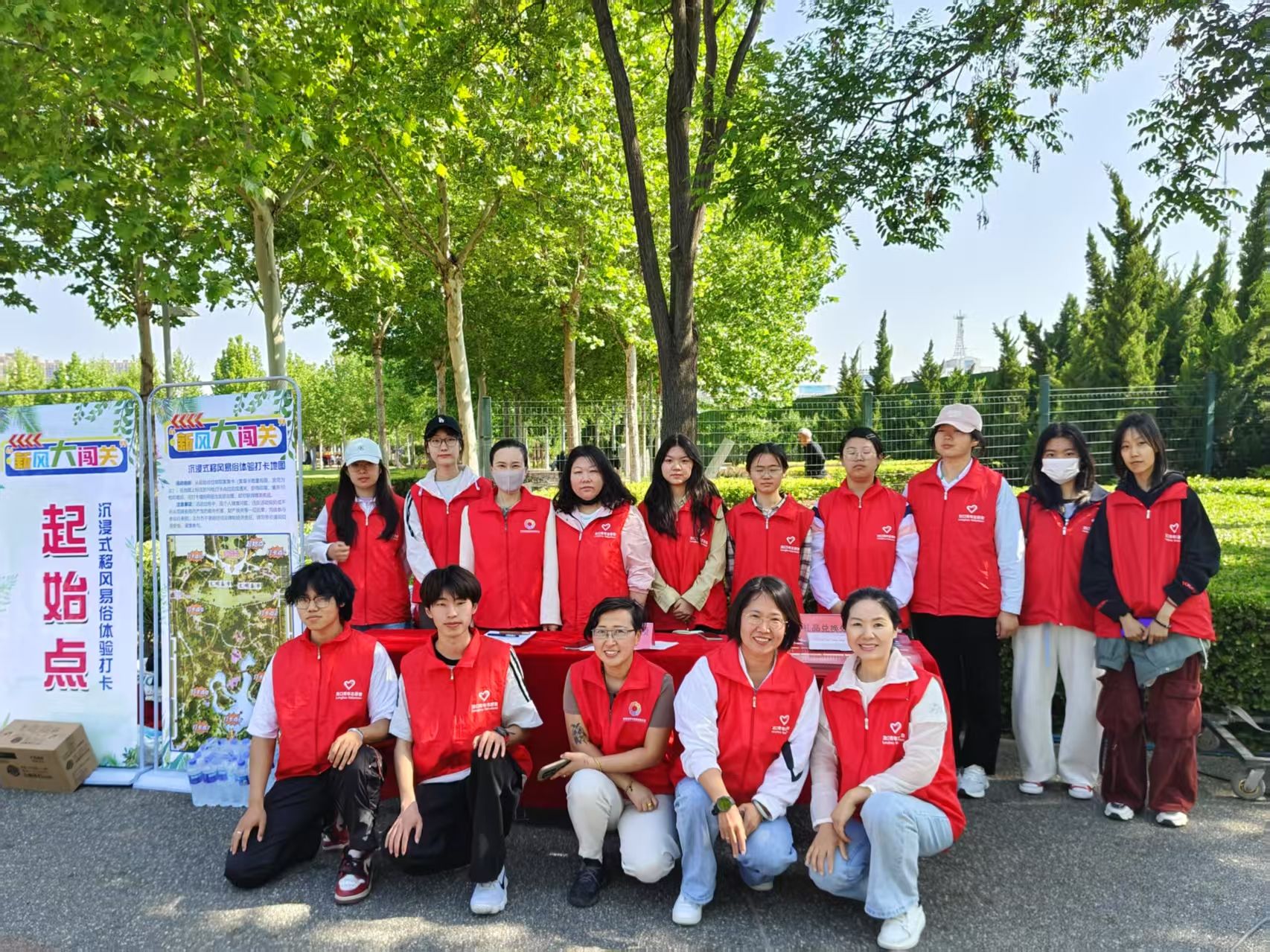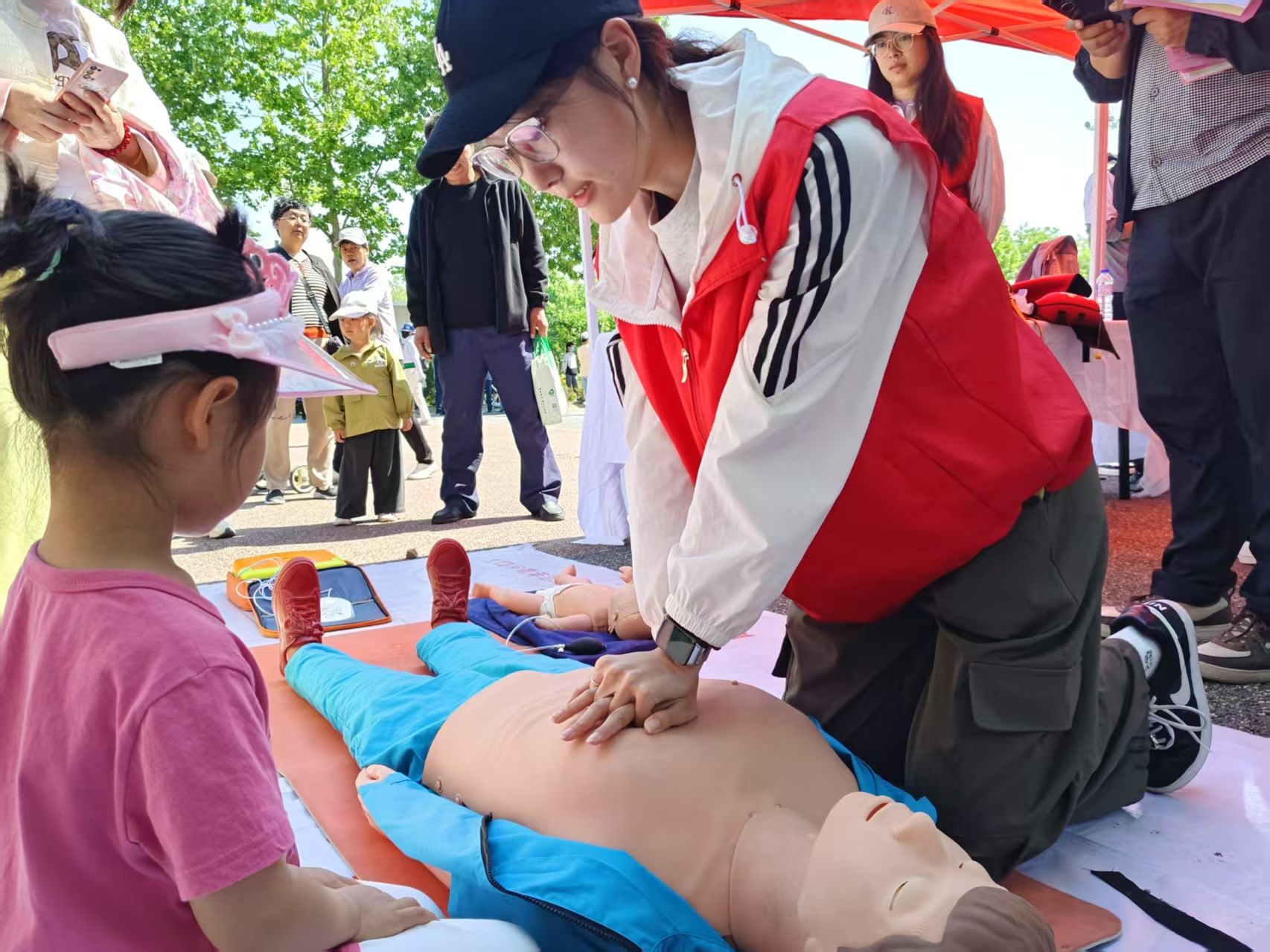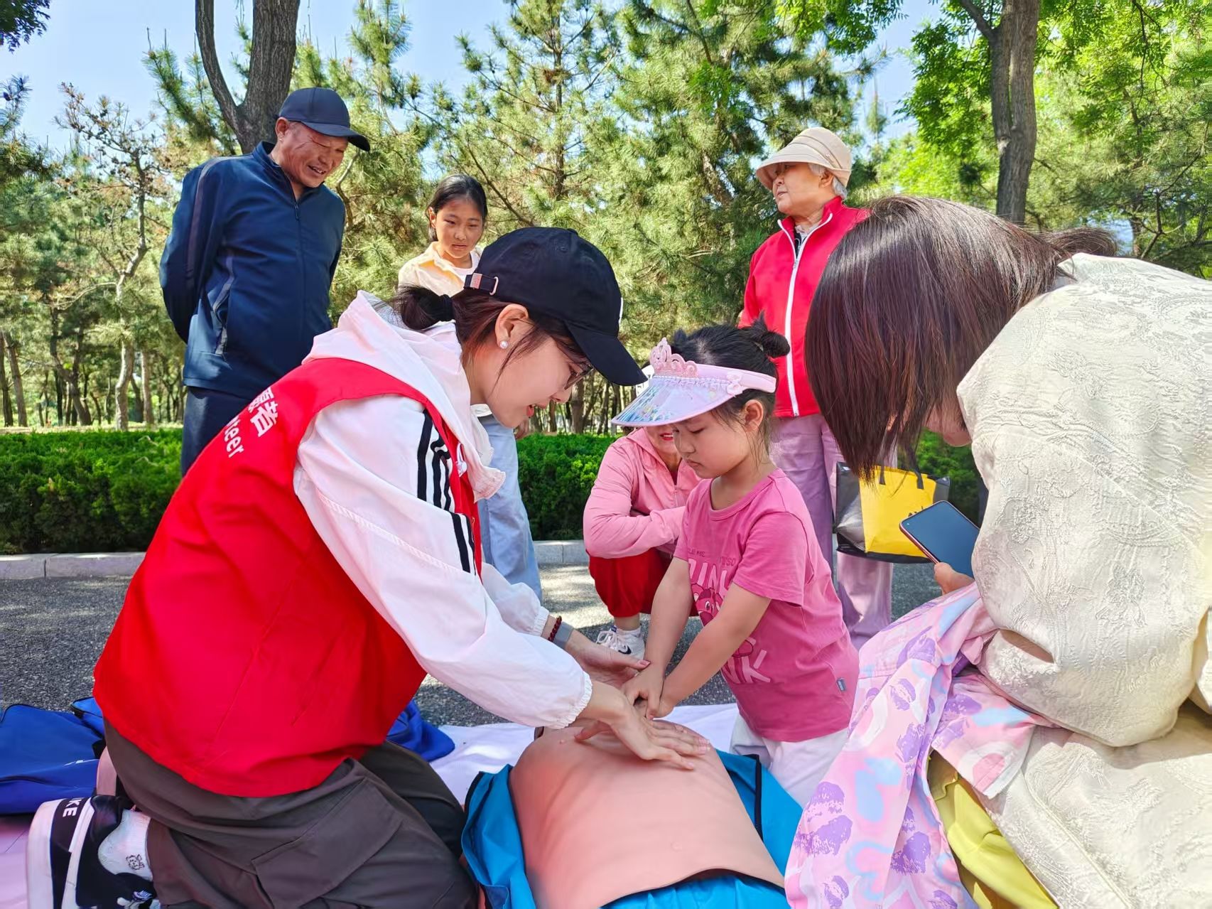 为深化公共文化服务内涵,传承中华优秀传统文化,同时提升市民应急救护能力,构建经济文化与公共安全协同发展新格局,5月18日,我院2022级社会工作专业实习生协同龙口市社会工作协会,于龙口市黄县林苑景区举办“赶大集”主题公益活动。活动伊始,实习生团队即高效完成物资调配、场地布置等筹备工作,为活动开展提供坚实保障。活动现场,社会工作机构依托专业资源,设立医疗急救知识科普实践专区,在专业急救员的指导下,实习生运用仿真教具,围绕心肺复苏术、人工呼吸操作规范、海姆立克急救法等核心内容,面向全年龄段市民开展系统性教学,并针对成人与婴儿急救操作差异进行专项演示,以标准化、规范化的教学流程,为市民打造专业化应急救护培训课堂。