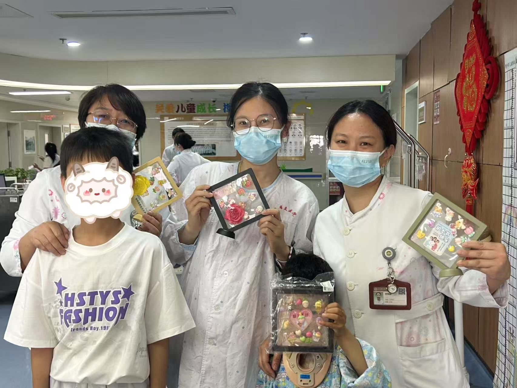 作品完成后,实习生们陪同患儿们来到护士站,将这份特别的节日祝福送到护士手中。一位参与活动的患儿家长表示:"社工和实习生们很有耐心,让孩子在治疗期间也能感受到快乐和温暖。"