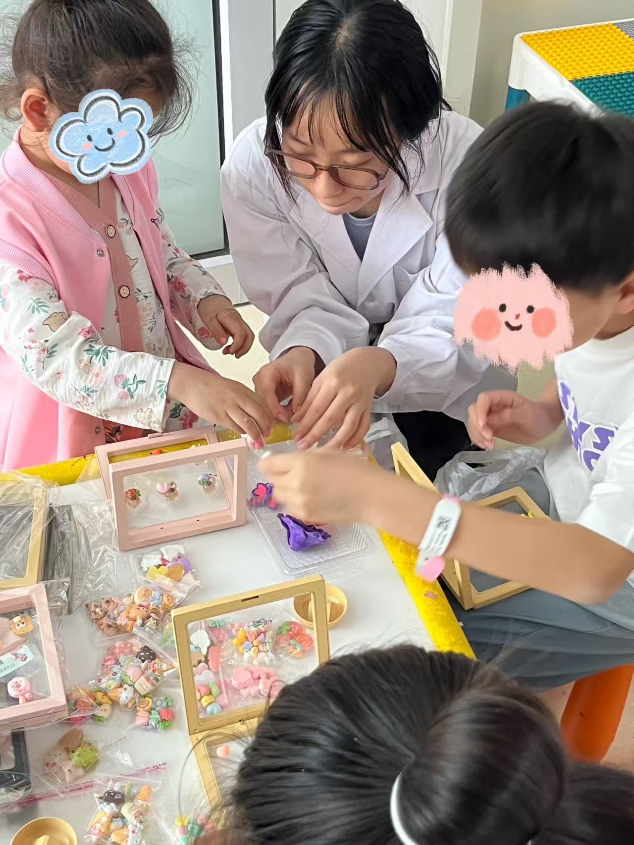 在带教社工的指导下,我院实习生充分发挥专业特长,协助五位住院患儿及其家属开展手工创作。活动现场,实习生们耐心引导患儿们用相框、黏土、小饰品等材料制作感恩礼物。孩子们在轻松愉快的氛围中,创作出一件件充满童趣的创意作品。