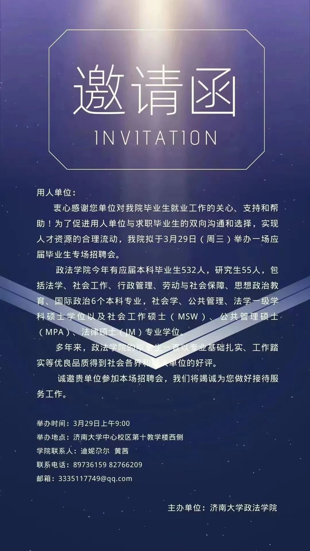 为了促进用人单位与求职毕业生的双向沟通和选择,实现人才资源的合理流动,我院拟于3月29日(周三)举办济南大学政法学院“‘职’点青春,畅享‘位’来”专场招聘会。