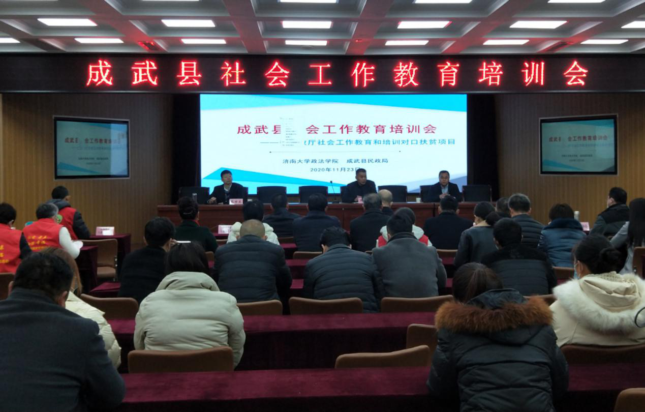本次社会工作教育培训会是我院承担的“山东省社会工作教育和培训对口扶贫项目”的服务内容之一。为贯彻落实《山东省民政厅山东省财政厅山东省扶贫办关于支持社会工作专业力量参与脱贫攻坚的实施意见》(鲁民〔2017〕81号),支持社会工作专业力量参与我省脱贫攻坚工作,加强贫困地区社会工作专业人才队伍建设,省民政厅选定10所开设社会工作专业的省内高校,作为山东省社会工作教育和培训对口扶贫项目的承接方,济南大学是其中之一,项目具体由政法学院社会学系承担实施,对口成武县民政局。