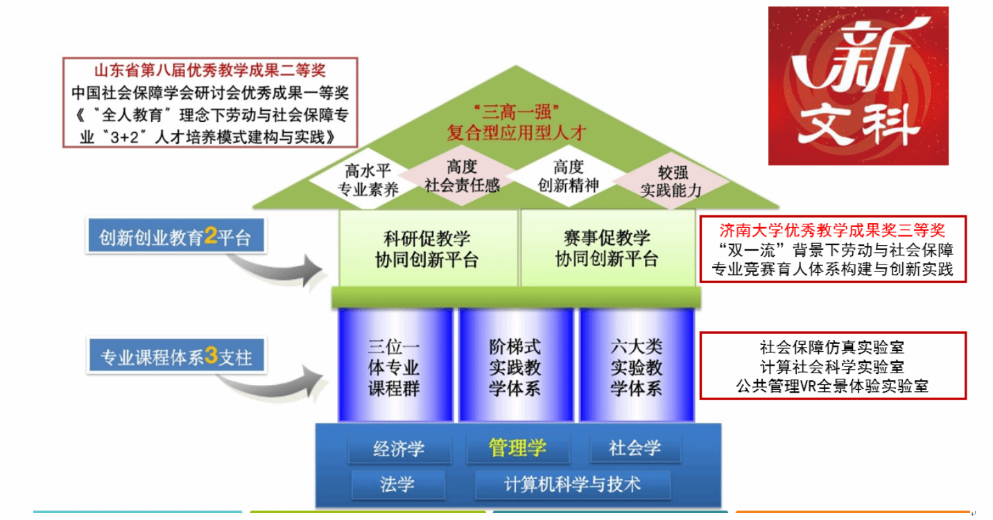 课程建设成就突出,拥有国家级一流本科课程1门,省级一流本科课程、省级精品课2门,校级一流课程和课程思政示范课6门,建有计算社会科学与数字社会治理山东省高校文科实验室、公共管理VR全景体验实验室、社会保障仿真实验室等,拥有实习基地30余处。