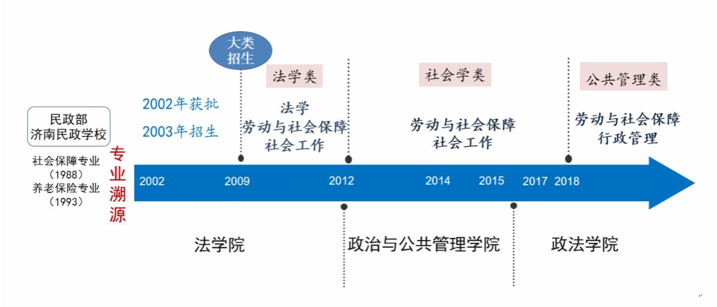 济南大学劳动与社会保障专业历史悠久,底蕴深厚。1988年原民政部济南民政学校在全国率先开设社会保障专业,2002年经教育部批准设立劳动与社会保障本科专业,为全国较早开展社会保障领域教学研究的院校之一。2017年获批省高水平应用型建设专业(群),2024年软科中国大学专业排名B类专业。本专业属于典型的文理兼收、多学科交叉融合专业(社会学、管理学、经济学、计算机科学与技术等),为学院新文科建设重点改革示范专业。